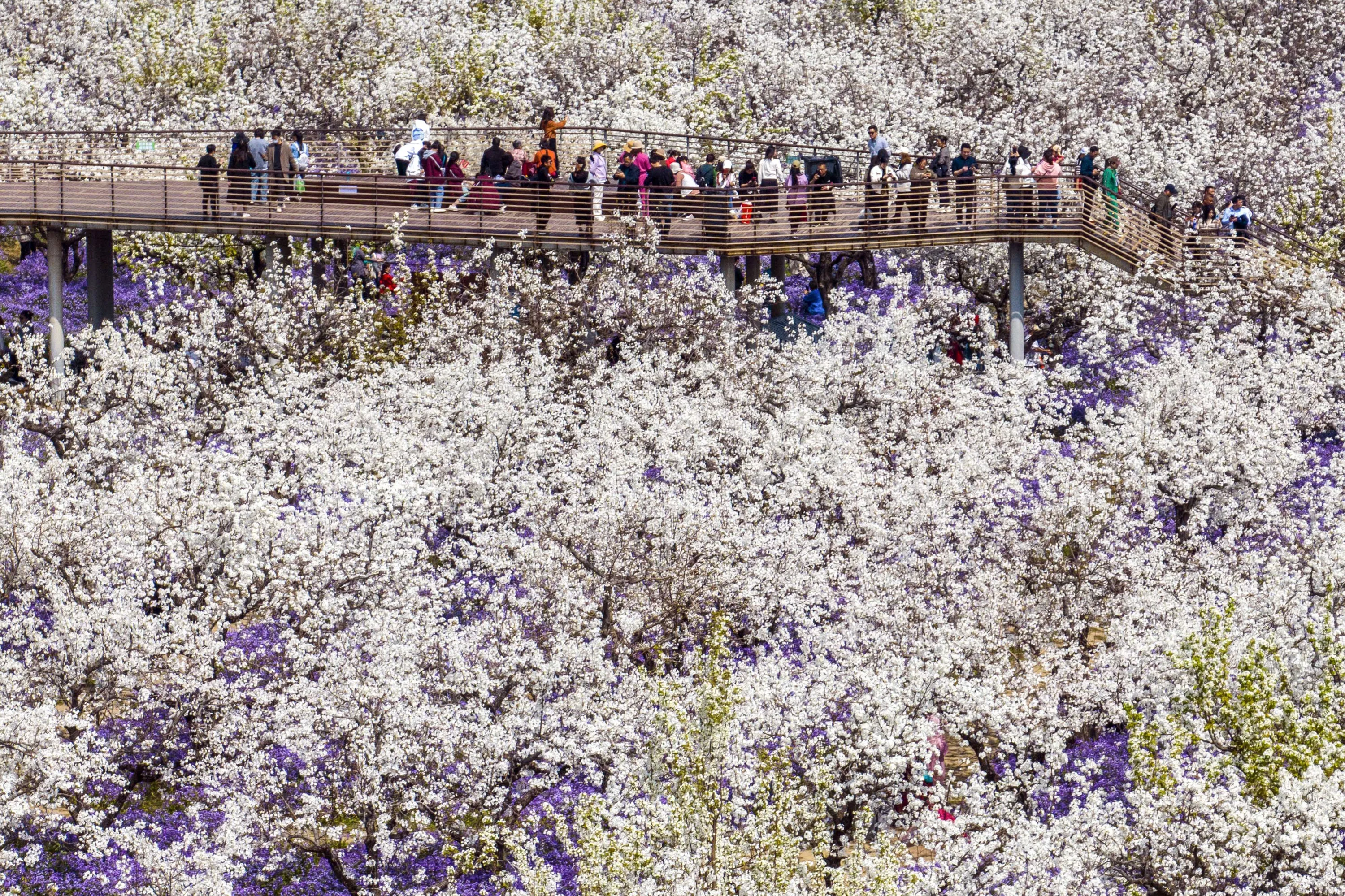 People walk among blossoming pear flowers in Suqian, in China's eastern Jiangsu province on March 28, 2023. (Photo by AFP Photo/China Stringer Network)