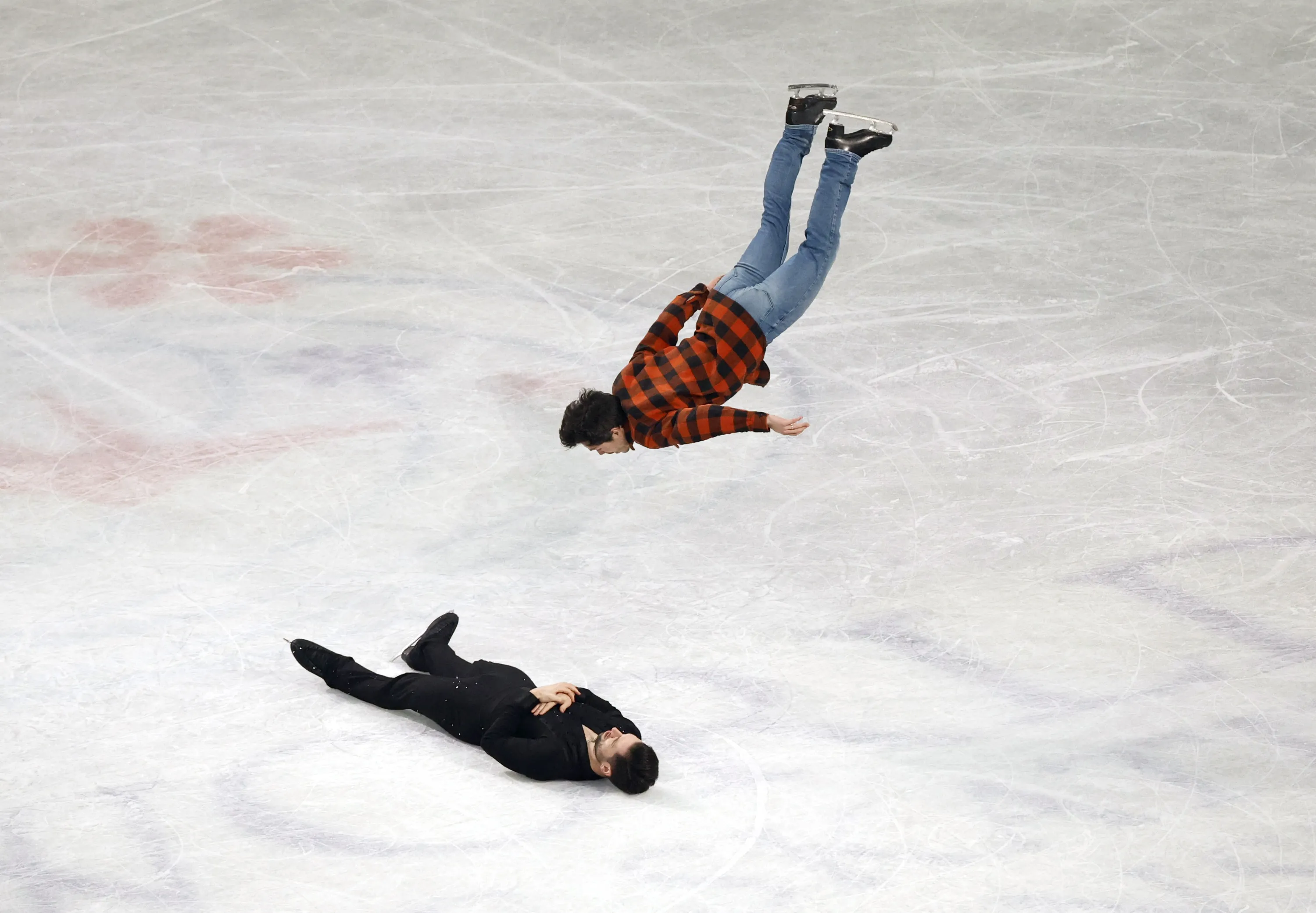 Canada's Keegan Messing backflips over Canada's Maxime Deschamps after the Gala Exhibition at the ISU World Figure Skating Championships 2023 in Saitama , Japan on March 26, 2023. (Photo by Issei Kato/Reuters)