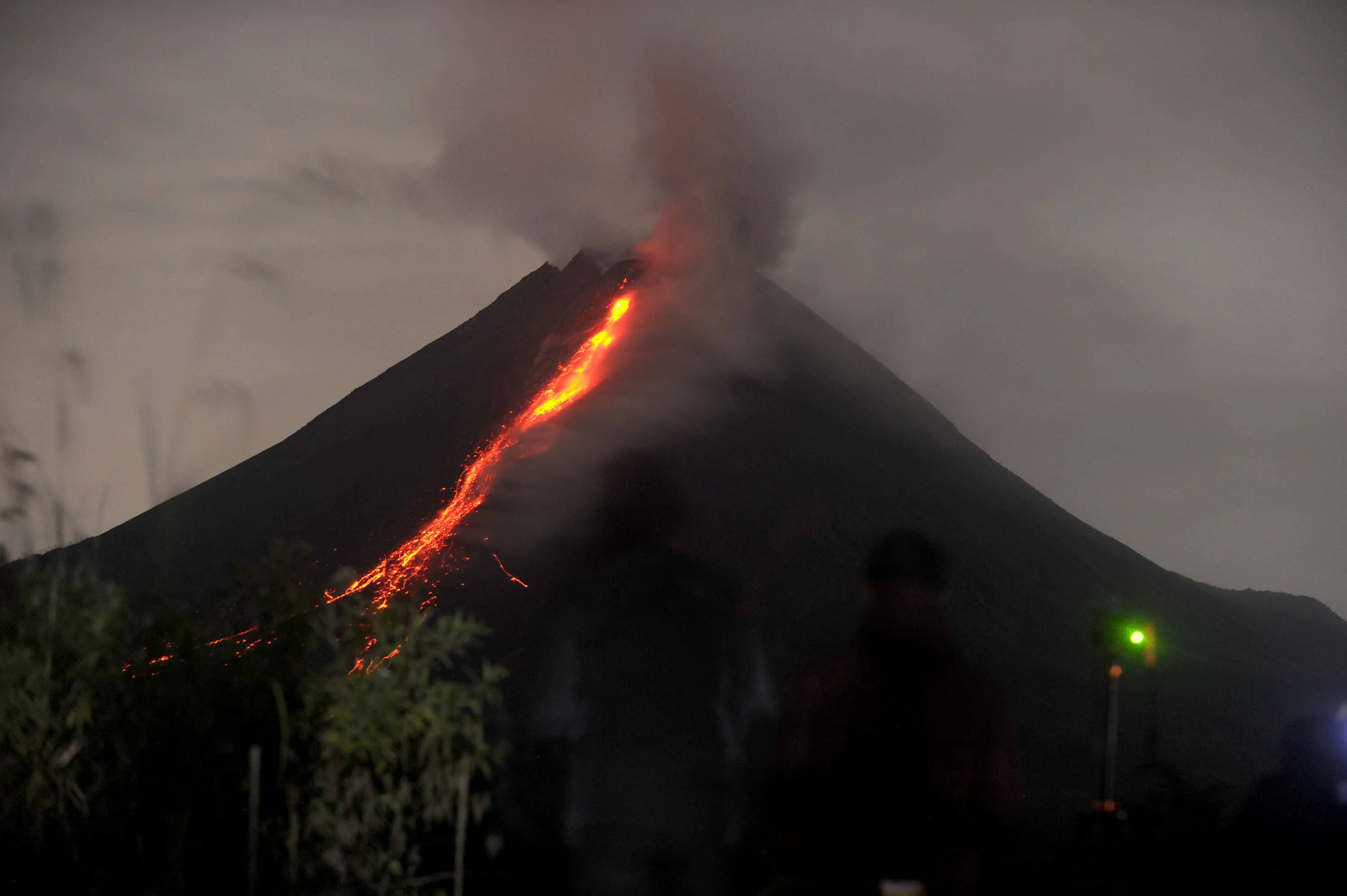 Lava gushes from Mount Merapi, the most active volcano in Indonesia, seen from the village of Tunggularum in Sleman, Yogyakarta, Indonesia on March 26, 2023. (Photo by Dasril Roszandi/Anadolu Agency via Getty Images)