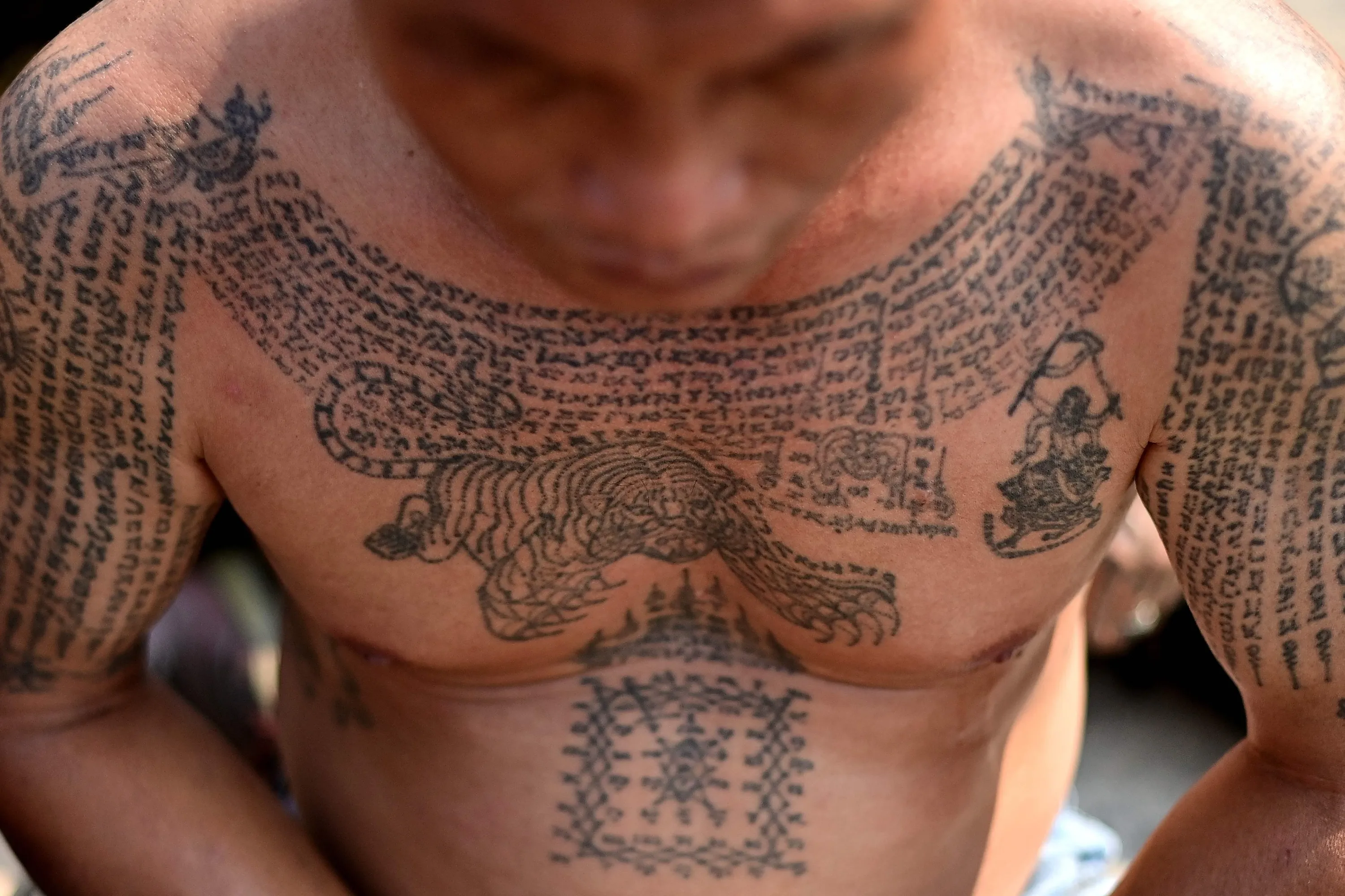A Buddhist devotee with a traditional “Sak Yant” tattoo offers prayers during an annual sacred tattoo festival at the Wat Bang Phra temple in Nakhon Pathom province on March 4, 2023. (Photo by Manan Vatsyayana/AFP Photo)