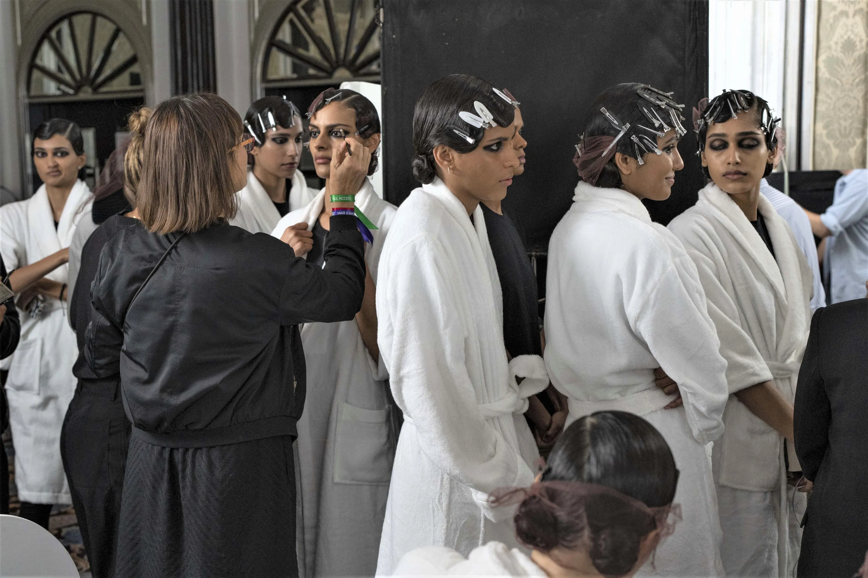 A model has makeup applied backstage prior to the Dior pre-fall 2023 collection show in Mumbai, India, Thursday, March 30, 2023. (Photo by Rafiq Maqbool/AP Photo)