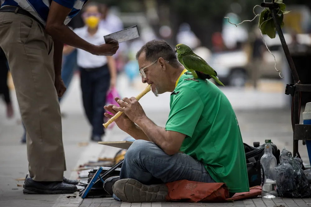 A man with a parrot plays the flute on a street in Caracas, Venezuela, 03 March 2023. (Photo by Miguel Gutiérrez/EPA)
