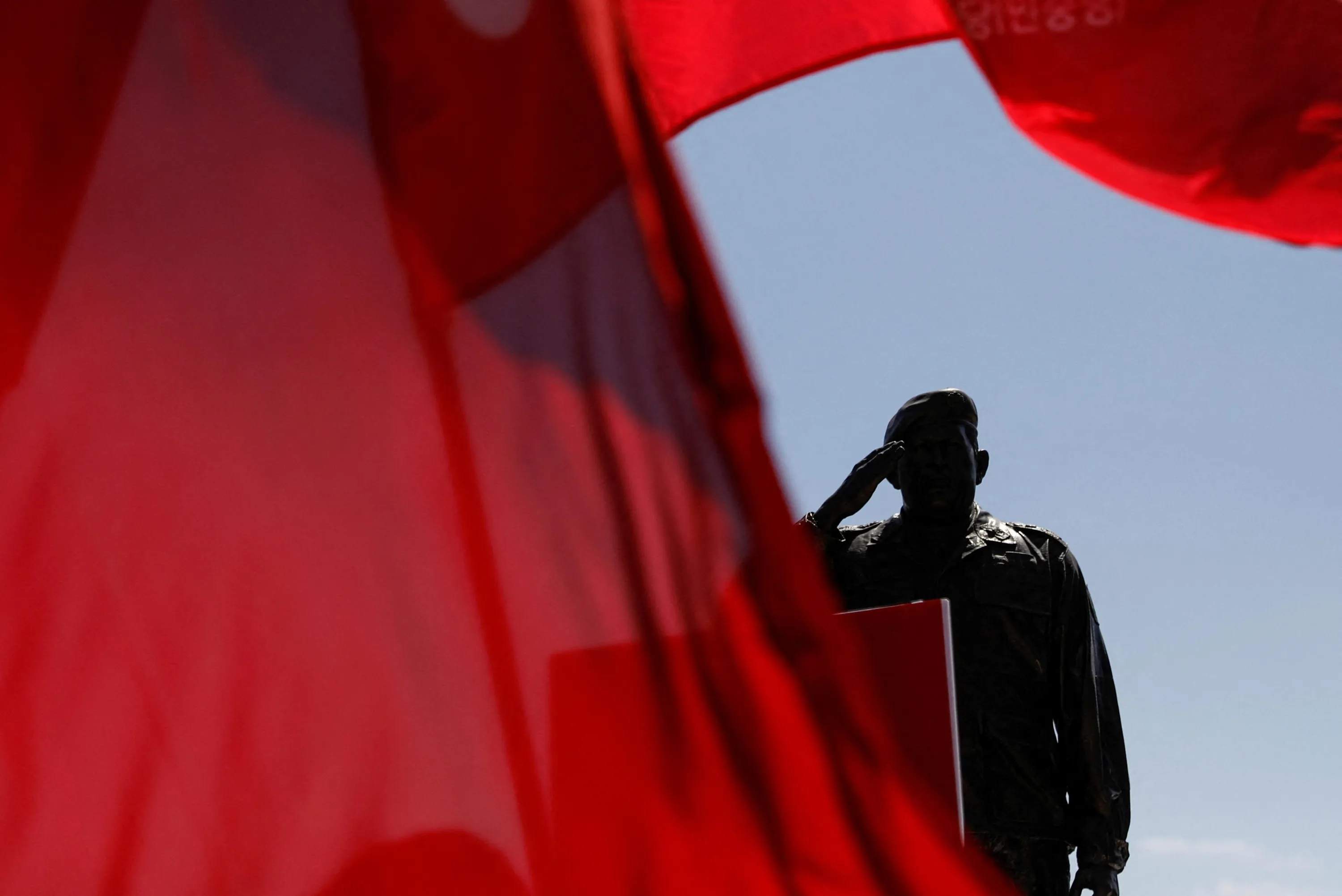Flags flutter in front of a statue of Venezuela's late President Hugo Chavez during a rally to mark the 10th anniversary of his death, in Caracas, Venezuela on March 5, 2023. (Photo by Leonardo Fernandez/Reuters)