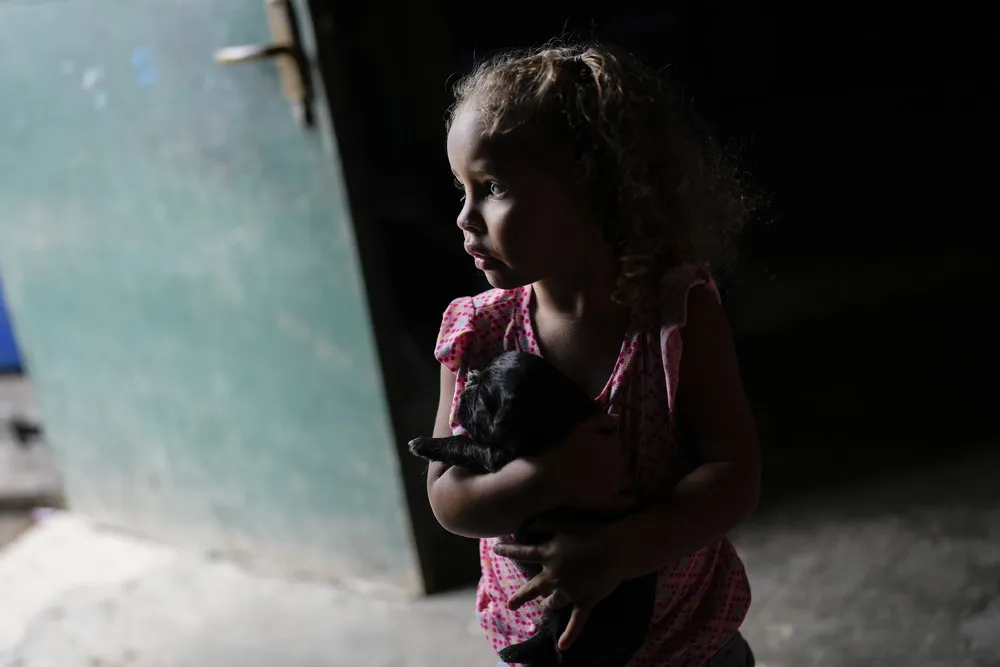 A girl carries a puppy as her grandmother fills a container with water pumped from a well in the Petare neighborhood of Caracas, Venezuela, Monday, March 20, 2023. The celebration of World Water Day on March 22 coincides with the start of the UN 2023 Water Conference in New York, aimed at solving the water and sanitation crisis. (Photo by Matias Delacroix/AP Photo)