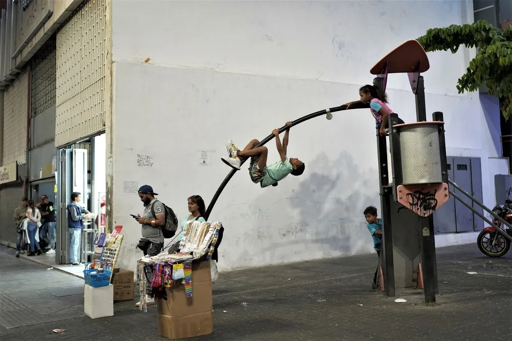 Children play on a small jungle gym along Sabana Grande boulevard in Caracas, Venezuela, Wednesday, March 1, 2023. (Photo by Ariana Cubillos/AP Photo)