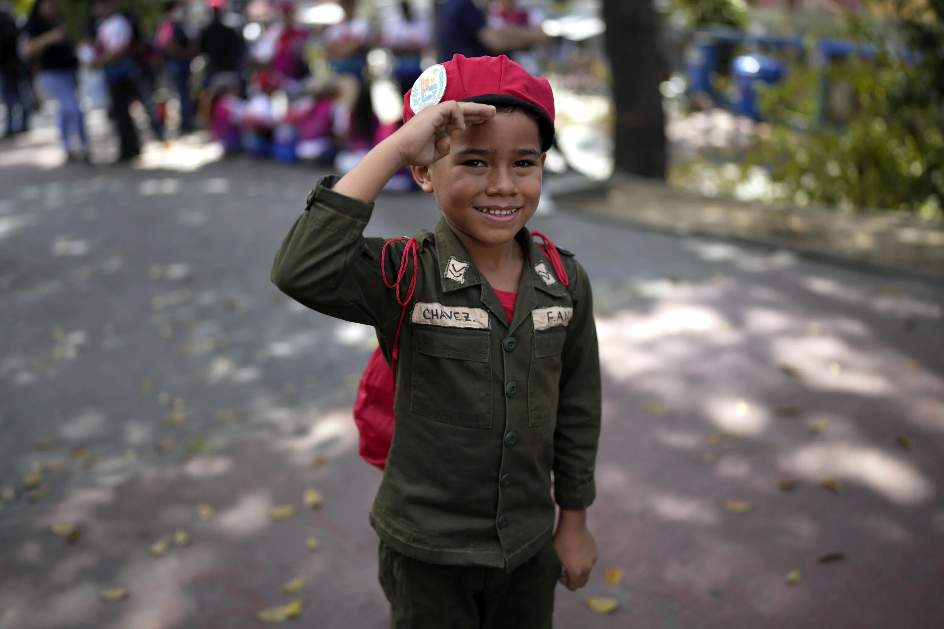 A boy dressed as late Venezuelan President Hugo Chavez salutes as he stands in line to visit Chavez's tomb during commemorations marking the tenth anniversary of his death, outside the Cuartel de la Montaña 4F in Caracas, Venezuela, Sunday, March 5, 2023Ariana Cubillos