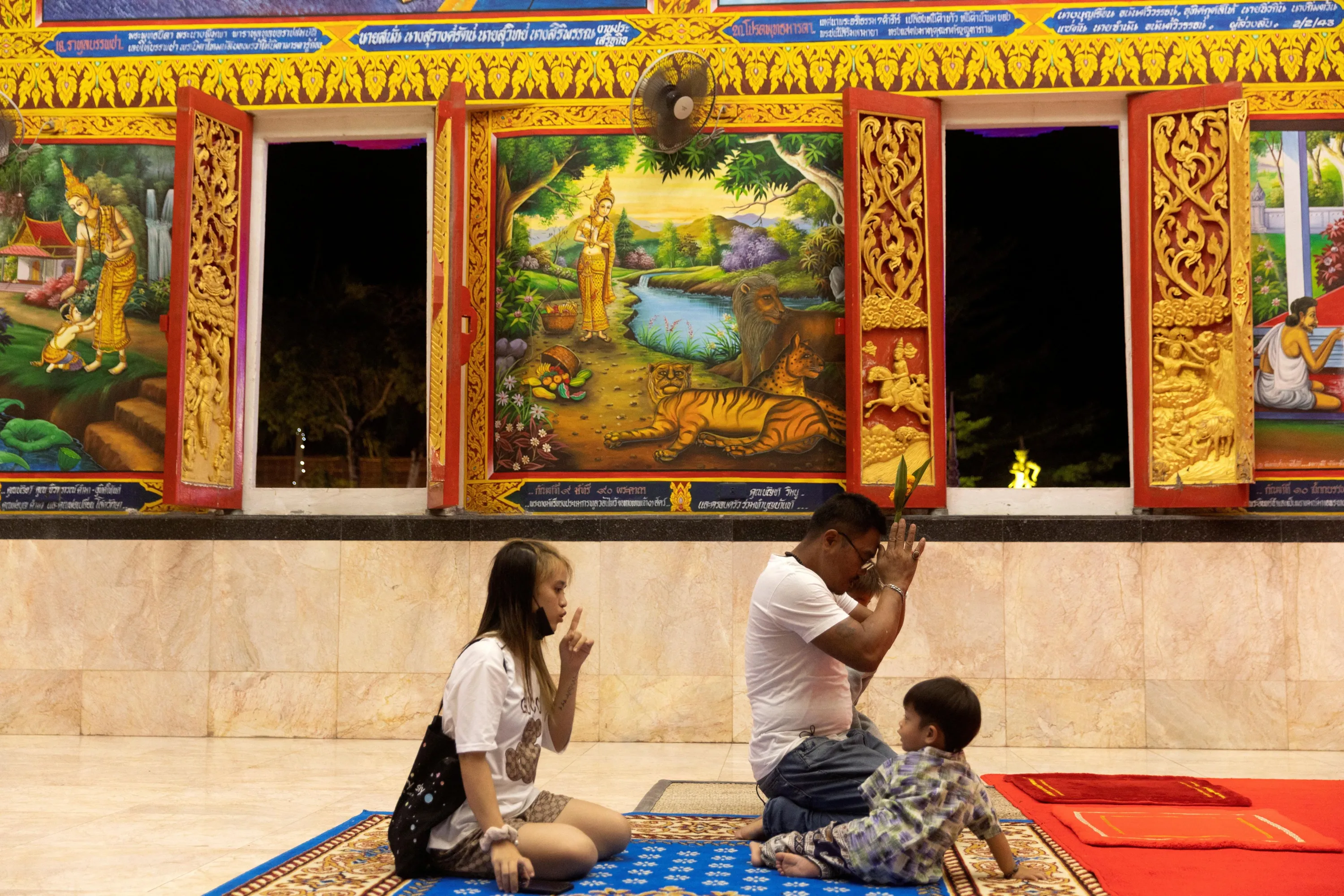 A family prays at Wat Cherngtalay temple during the commemoration of Makha Bucha Day in Phuket, Thailand on March 6, 2023. (Photo by Jorge Silva/Reuters)