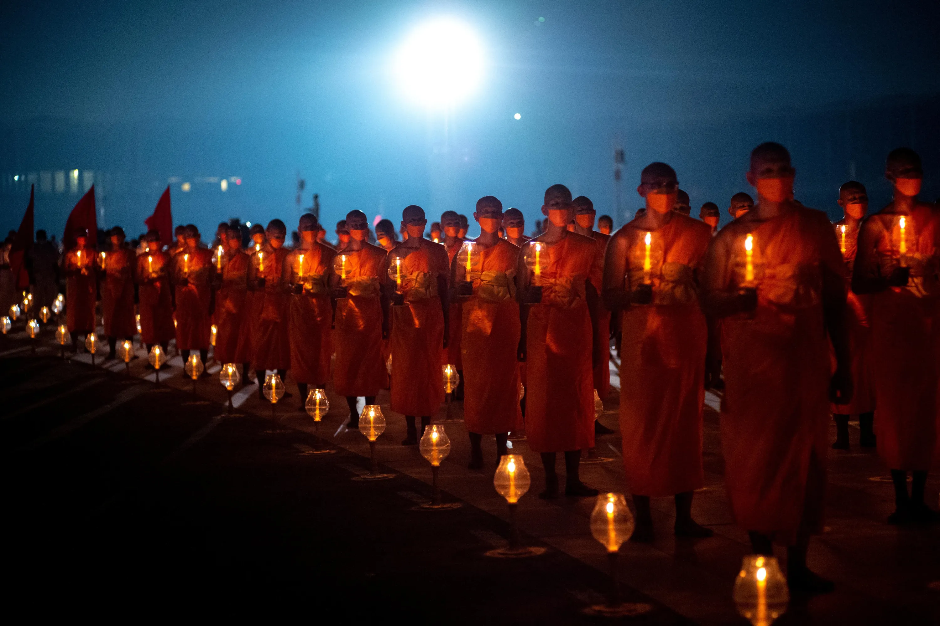 Buddhist monks carry candle lights at the Wat Phra Dhammakaya temple during a ceremony commemorating Makha Bucha Day in Pathum Thani province outside Bangkok, Thailand on March 6, 2023. (Photo by Athit Perawongmetha/Reuters)