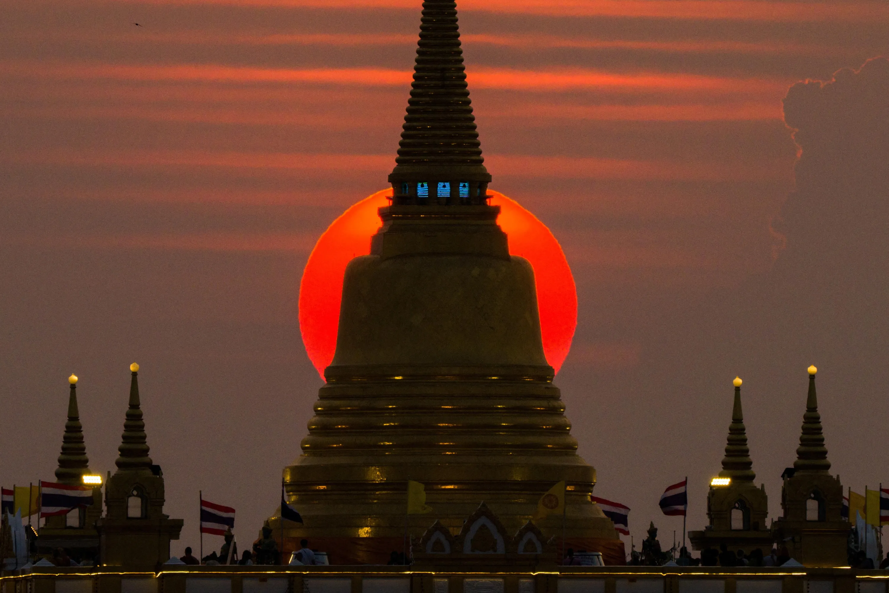 The sun sets behind Wat Saket Temple, or Golden Mount in Bangkok, Thailand on March 19, 2023. (Photo by Athit Perawongmetha/Reuters)