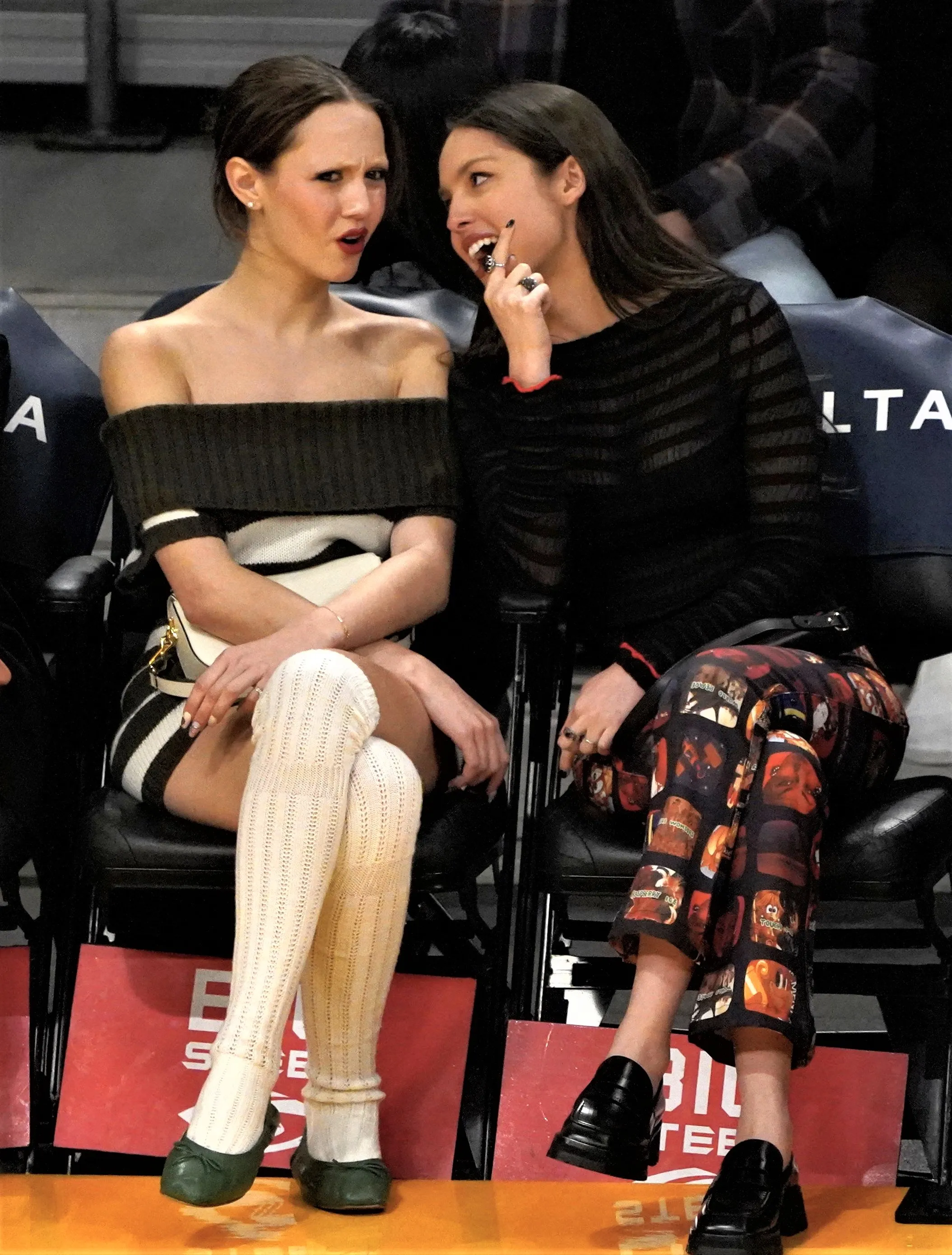 American actress and socialite Iris Apatow (L) and American singer-songwriter Olivia Rodrigo attends the Oklahoma City Thunder and Los Angeles Lakers game at Crypto.com Arena on March 24, 2023 in Los Angeles. (Photo by London Entertainment/Splash News and Pictures)