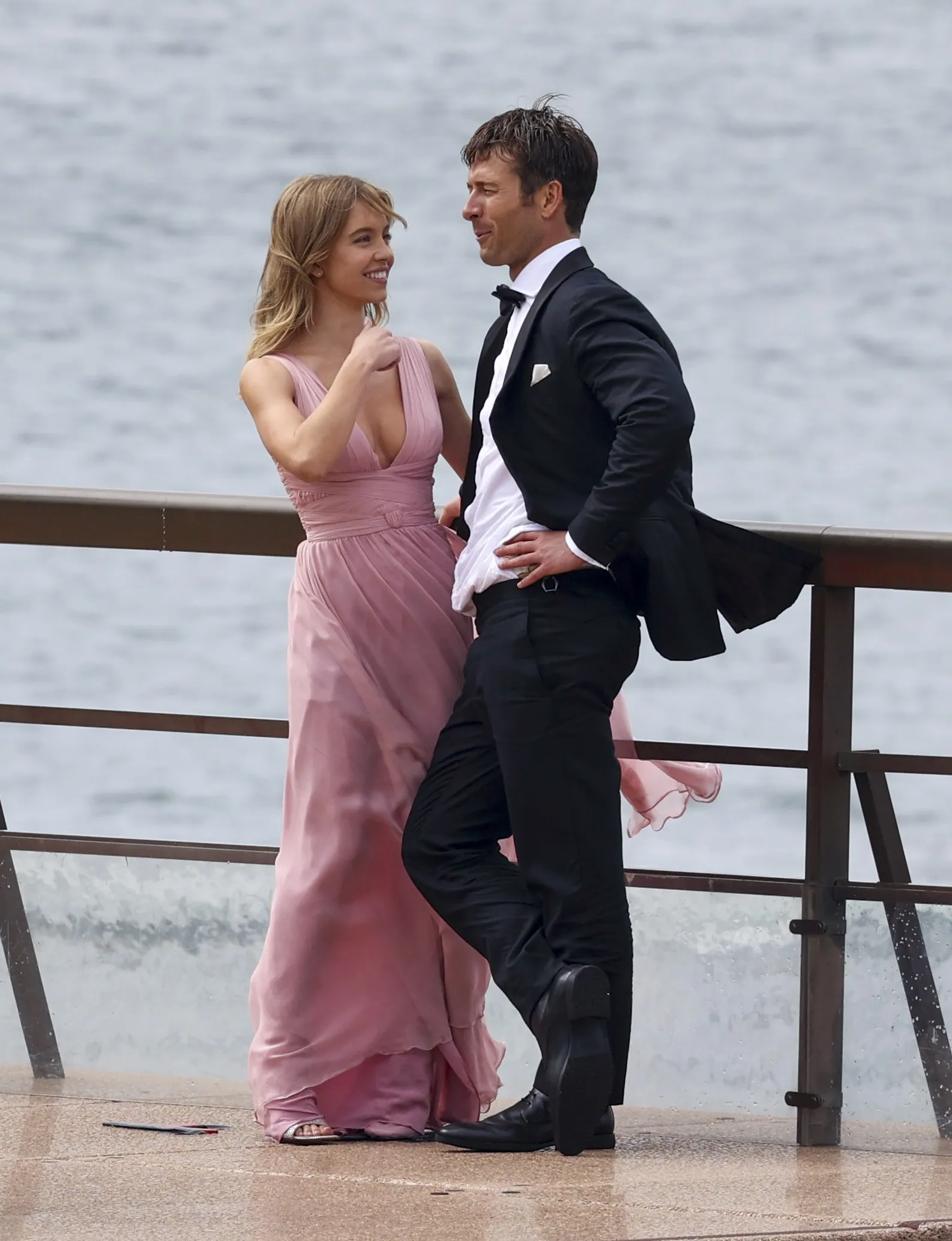 American actors Sydney Sweeney and Glen Powell film their new rom-com on the steps of the Sydney Opera House, in Australia in the last decade of March 2023. (Photo by Media-Mode/Splash News and Pictures)