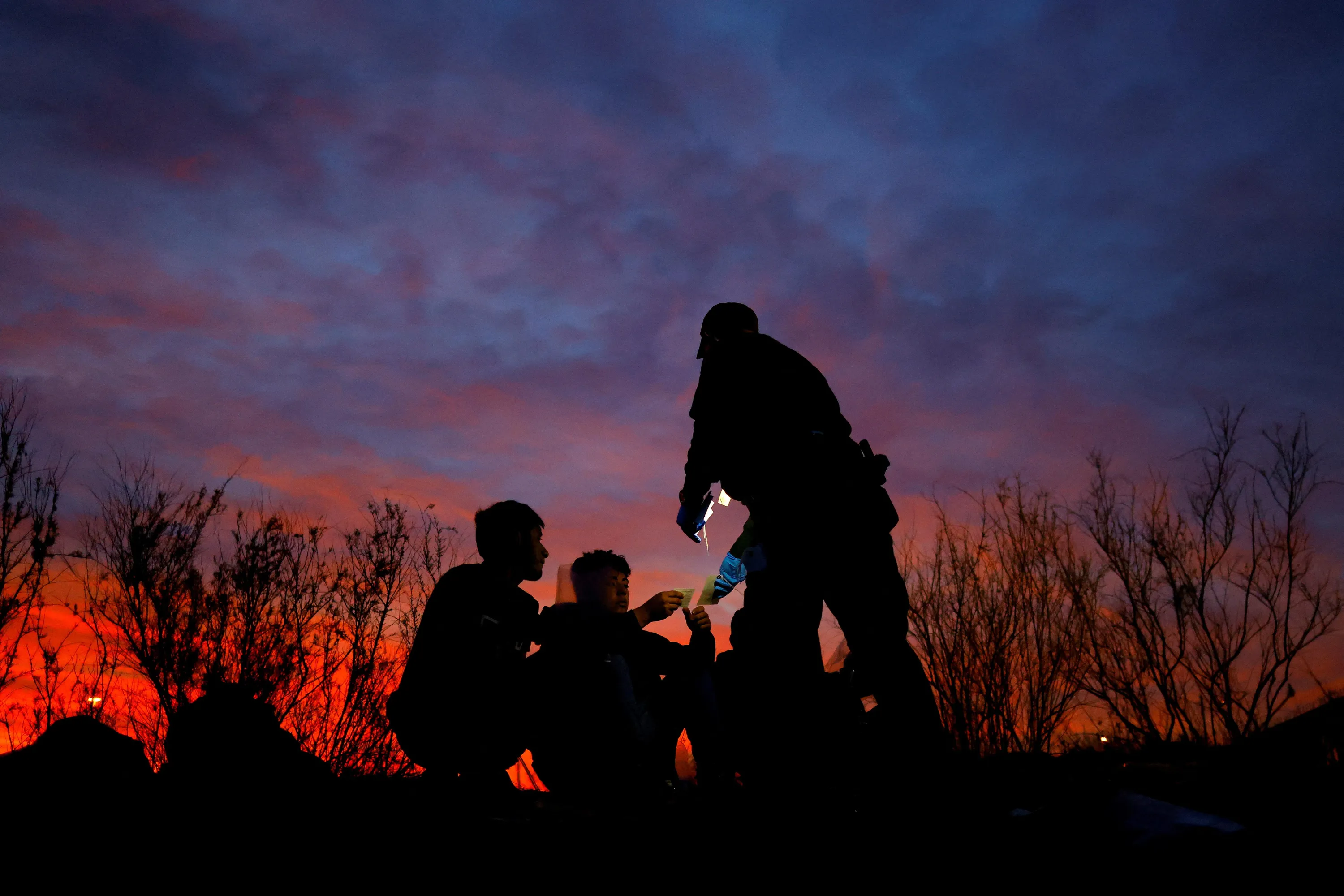 Migrants are detained by a U.S. Customs and Border Protection (CBP) agent after crossing into the United States from Mexico, in Sunland Park, New Mexico, U.S. March 23, 2023. (Photo by Jose Luis Gonzalez/Reuters)