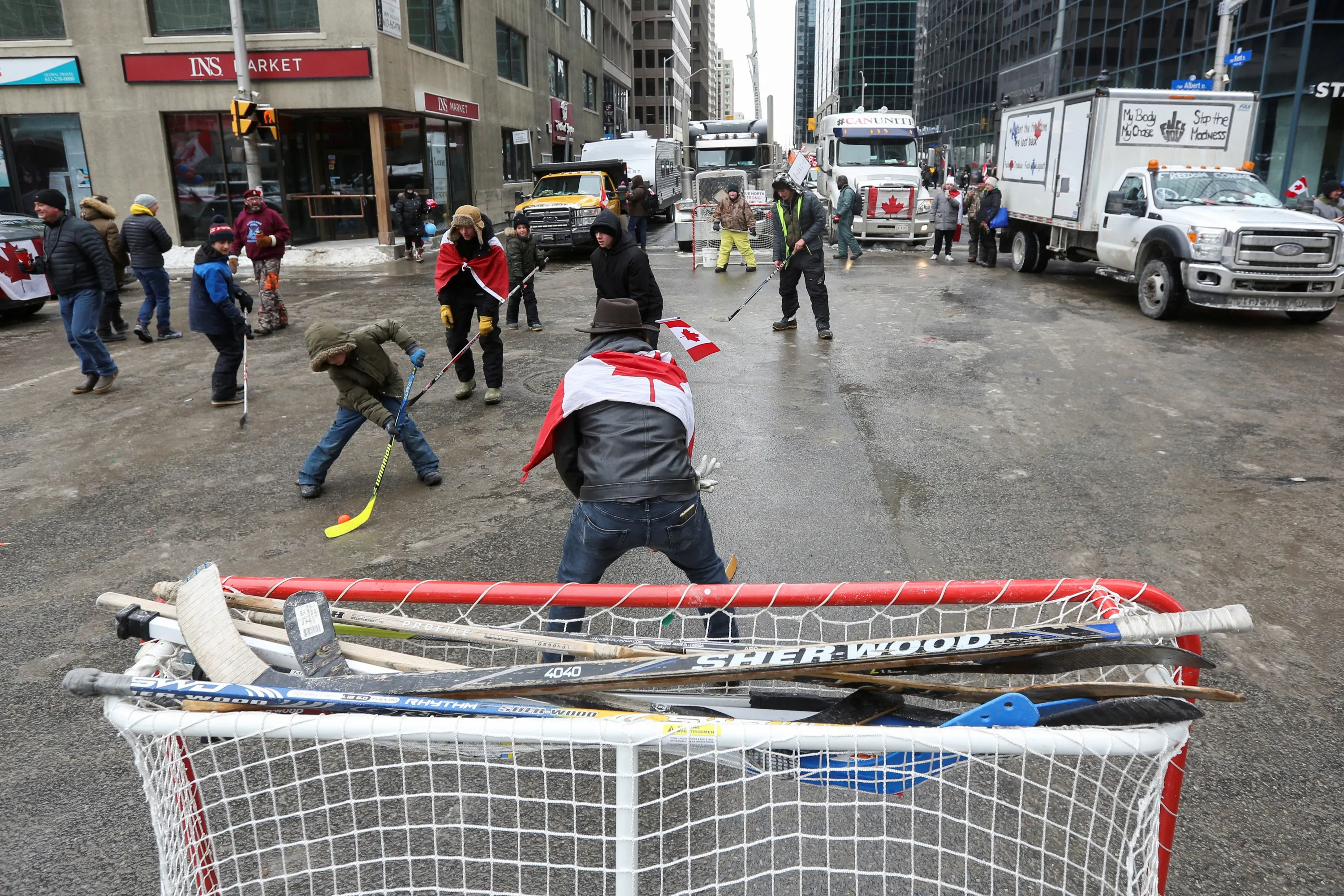 People play street hockey on a closed street, as truckers and supporters continue to protest coronavirus disease (COVID-19) vaccine mandates, in Ottawa, Ontario, Canada, February 6, 2022. (Photo by Lars Hagberg/Reuters)