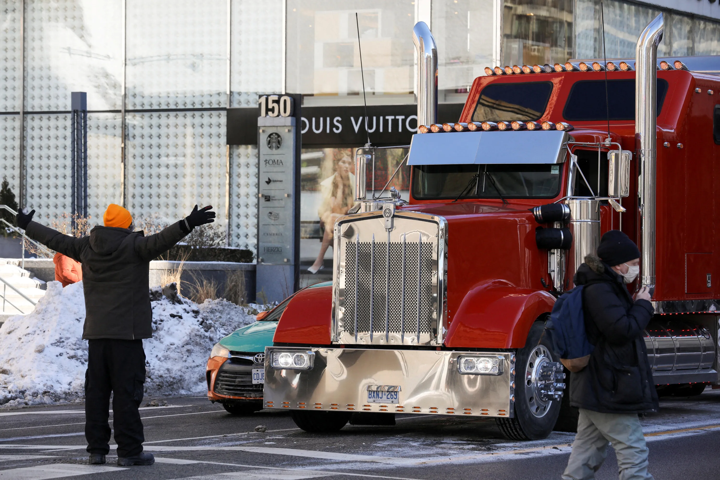 A counter-protester tries to block truckers and supporters' protest against coronavirus disease (COVID-19) vaccine mandates, in Toronto, Ontario, Canada, February 5, 2022. (Photo by Chris Helgren/Reuters)