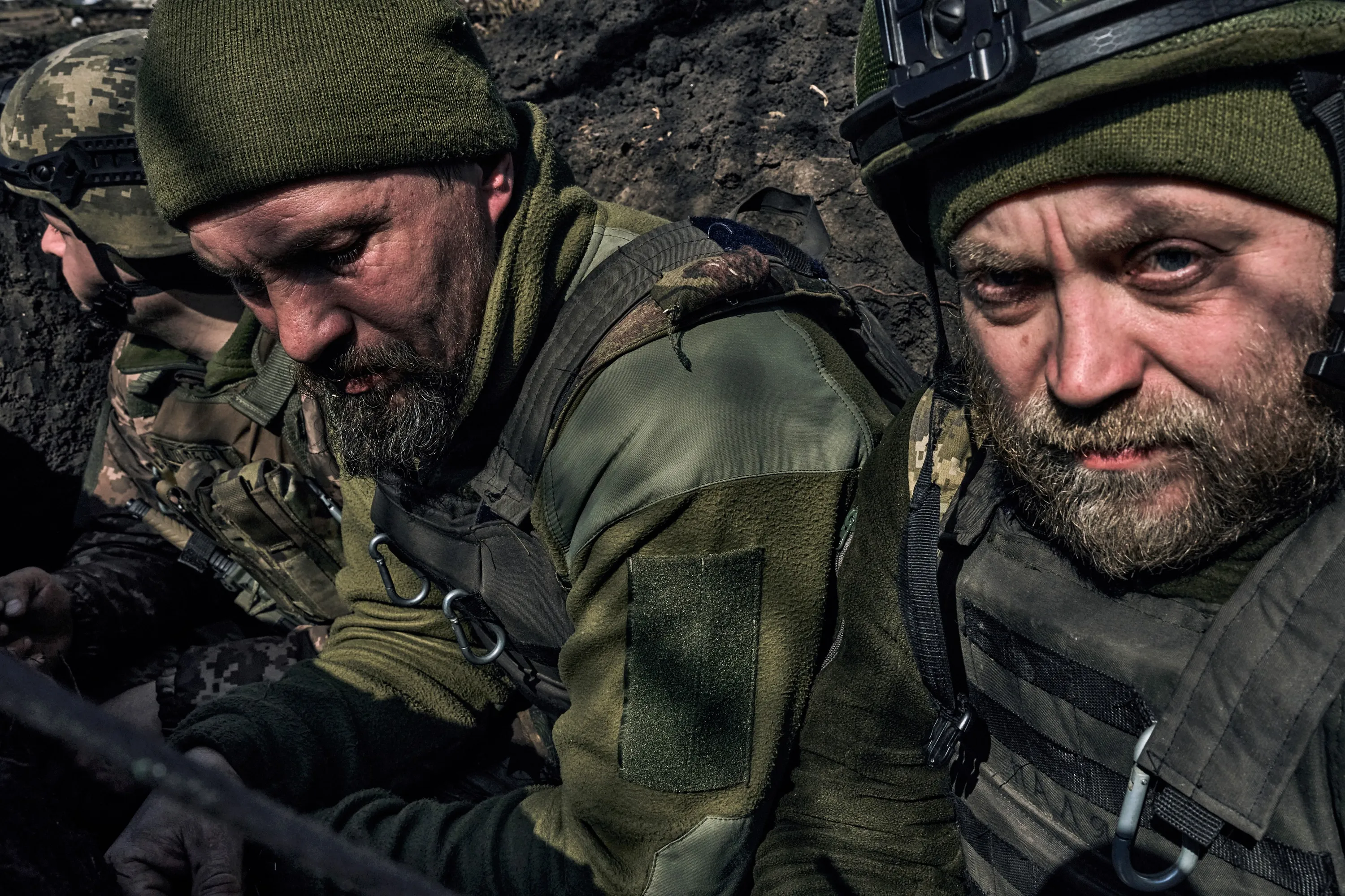 Ukrainian soldiers sit in a trench along the frontline during fighting with Russian troops near Bakhmut, Sunday, March 26, 2023. (Photo by Libkos/AP Photo)