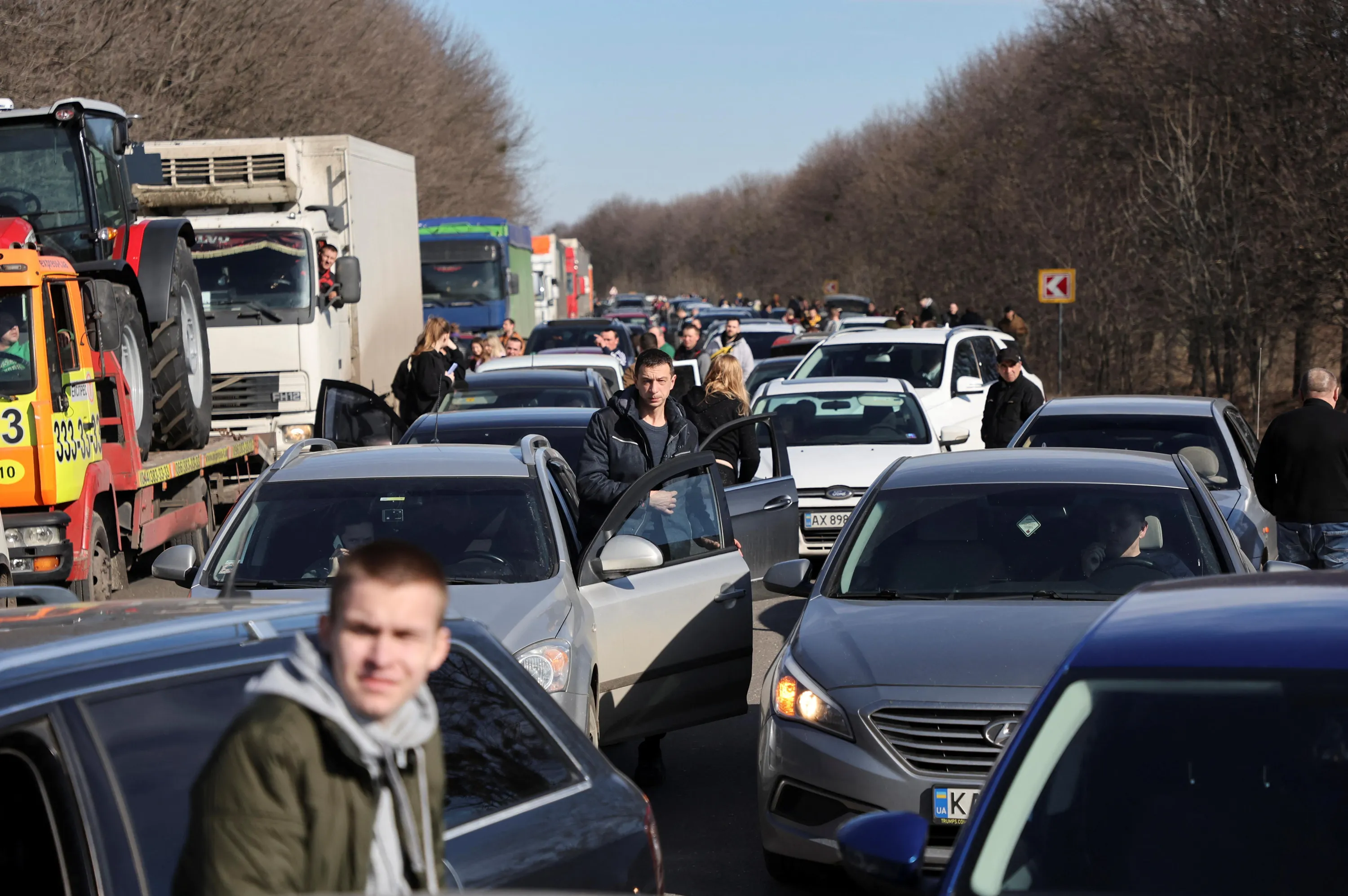 People wait in a traffic jam as they leave the city of Kharkiv, after Russian President Vladimir Putin authorised a military operation in eastern Ukraine, in Kharkiv region, Ukraine on February 24, 2022. (Photo by Antonio Bronic/Reuters)