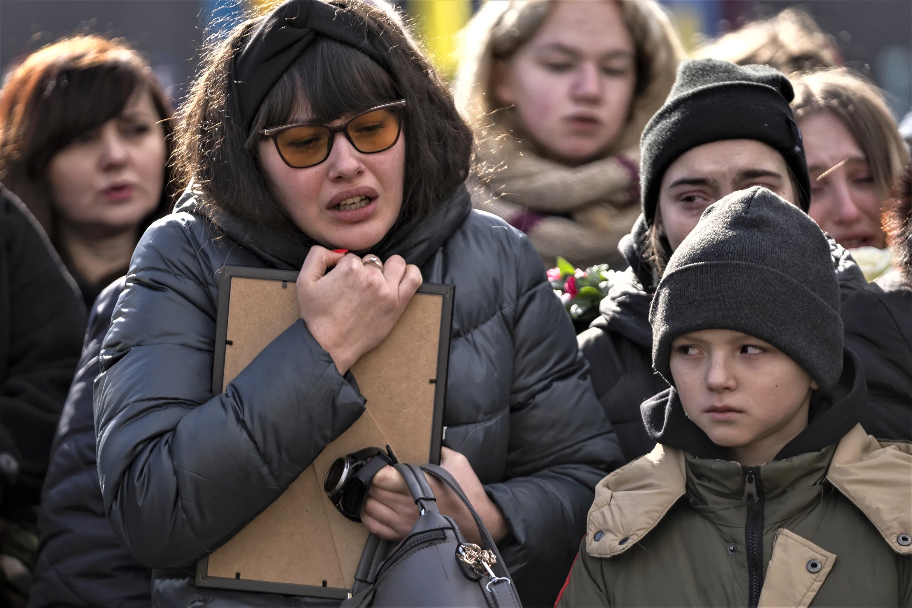Mother Tetiana and brother Vlad mourn during the funeral of 20 year-old soldier Vladyslav Belechynskyi, at Lviv cemetery, on Wednesday, February 22, 2023. Belechynskyi died near Bakhmut, on Feb.16. (Photo by Petros Giannakouris/AP Photo)