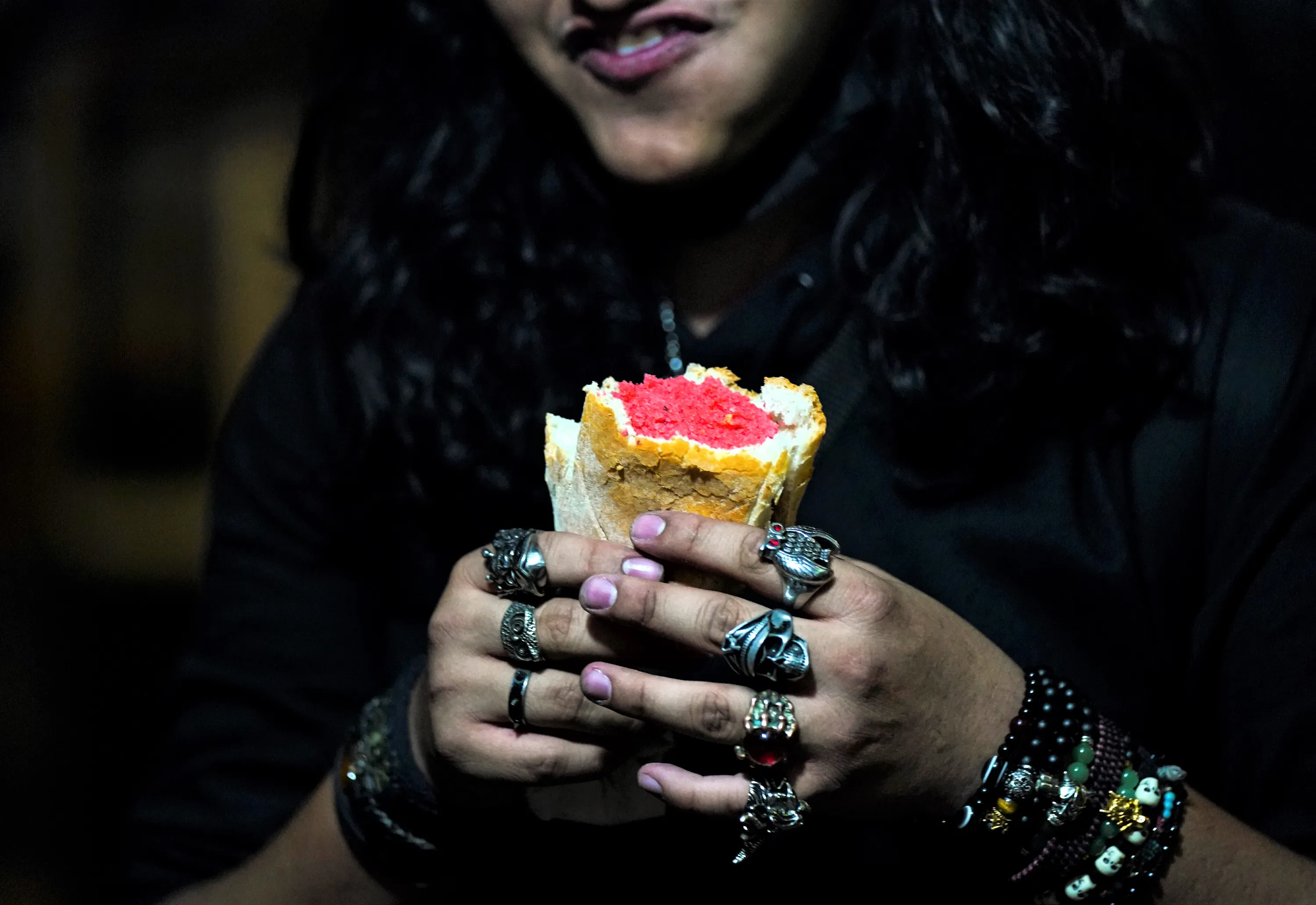 A rock musician eats a sweet masa tamal inside a crusty bun at a street stand, before his gig in downtown Mexico City, Thursday, January 26, 2023. Tamales date to pre-Hispanic times when Olmecs, Mexicas and Mayas prepared them for religious rituals, offerings and even placed them in tombs. (Photo by Fernando Llano/AP Photo)