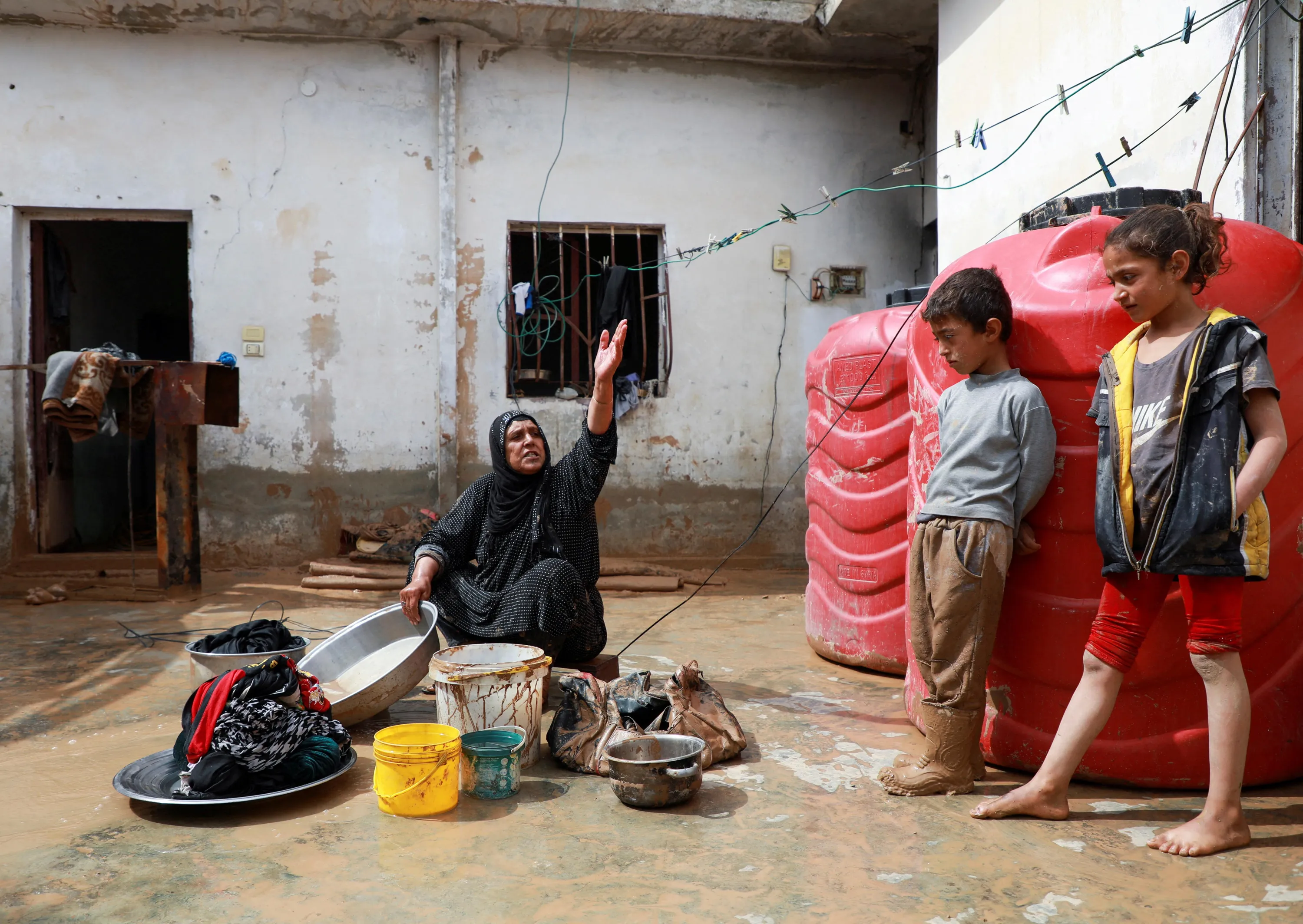 A woman gestures as she washes clothes at her house which was flooded due to heavy rainfall in Hasaka, Syria on March 18, 2023. (Photo by Orhan Qereman/Reuters)