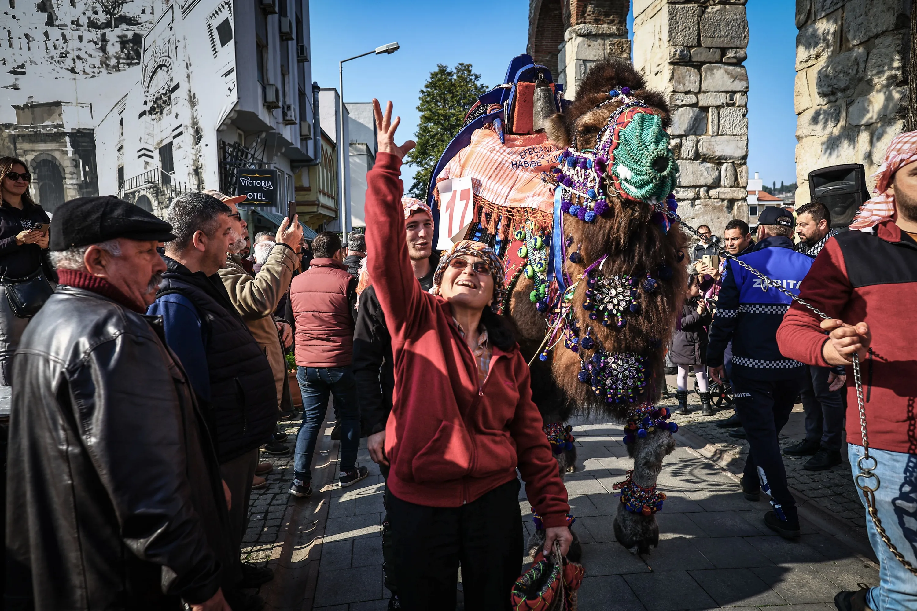 Habibe Yuksel and her team celebrate after winning the Camel Beauty Contest at the Selcuk Camel Wrestling Festival in Selcuk, Turkey, 14 January 2023. (Photo by Sedat Suna/EPA/EFE)