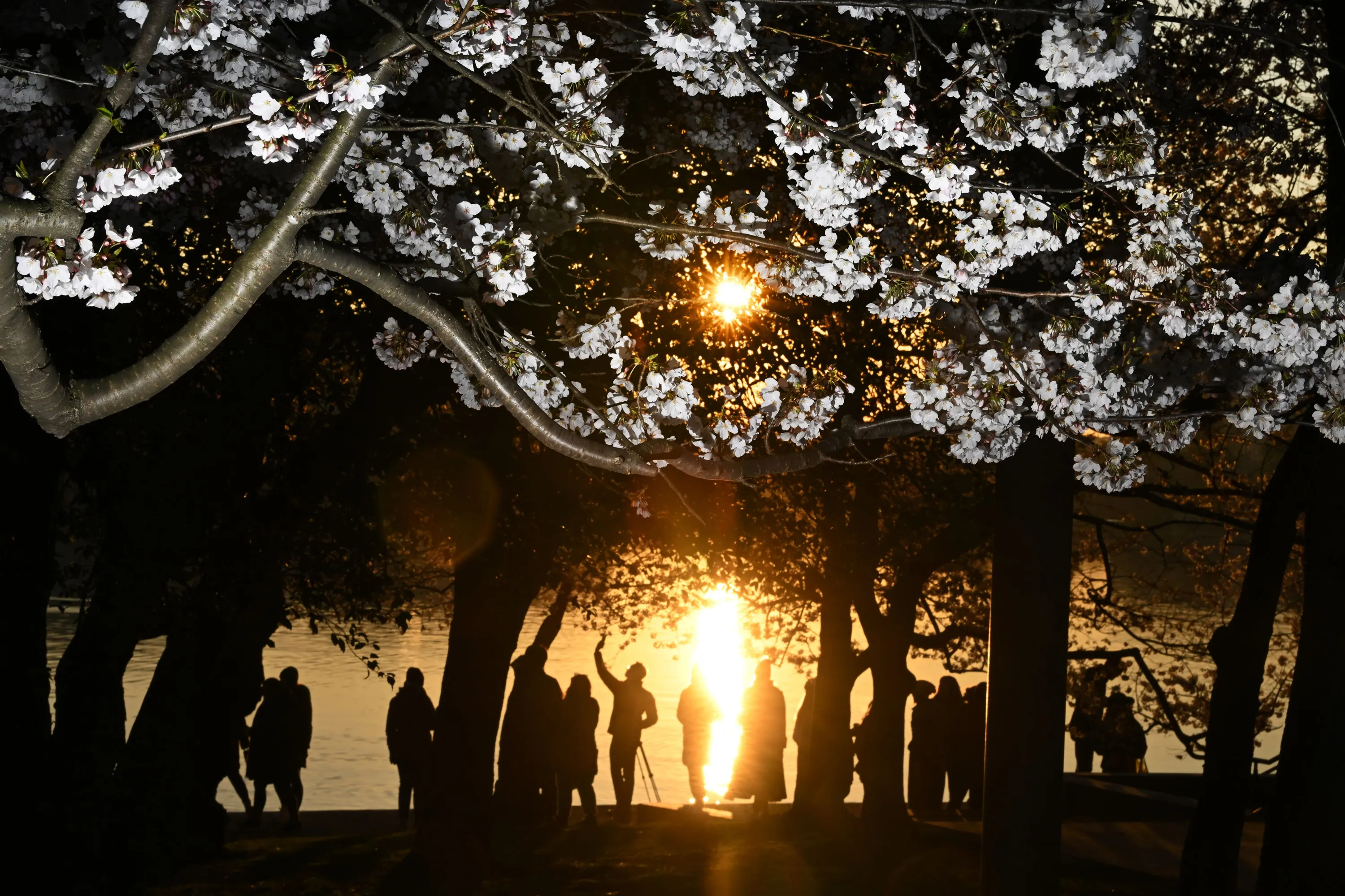 People gather to view blooming cherry blossoms and the rising sun along the Tidal Basin on Tuesday March 21, 2023 in Washington, DC. The blossoms are nearing peak bloom. (Photo by Matt McClain/The Washington Post)