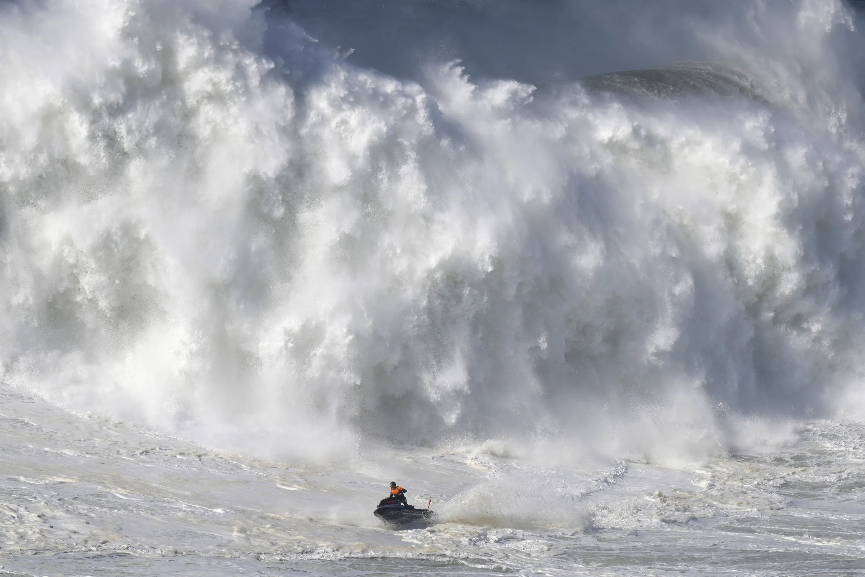 A jet ski steers away from a crashing wave during a big wave surfing session at Praia do Norte, or North Beach, in Nazare, Portugal, Friday, February 25, 2022. (Photo by Armando Franca/AP Photo)