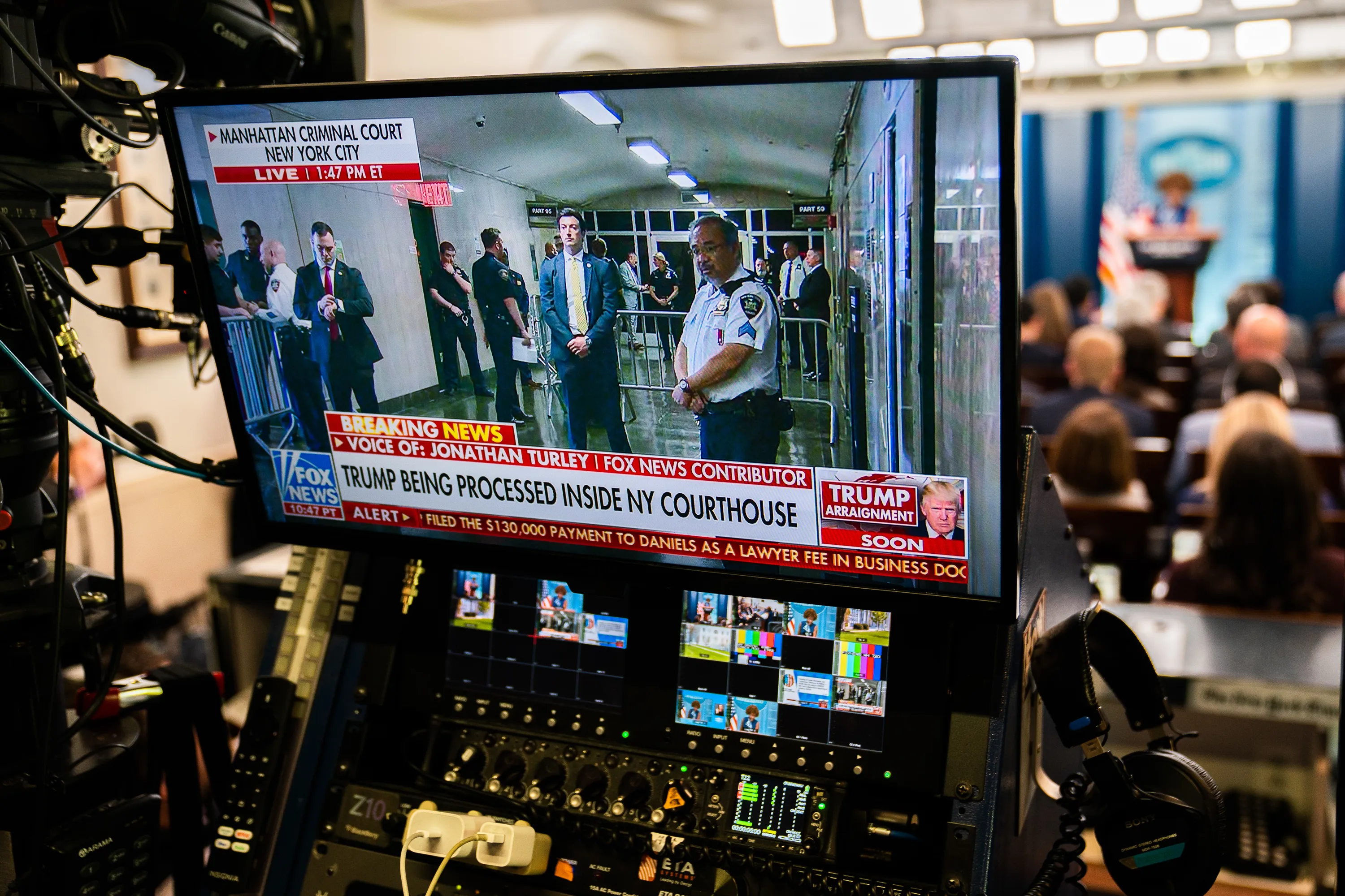 Former President Donald Trump’s arraignment on screen during White House Press Secretary Karine Jean-Pierre daily press briefing in the James Brady Room at the White House on April 4, 2023. (Photo by Demetrius Freeman/The Washington Post)