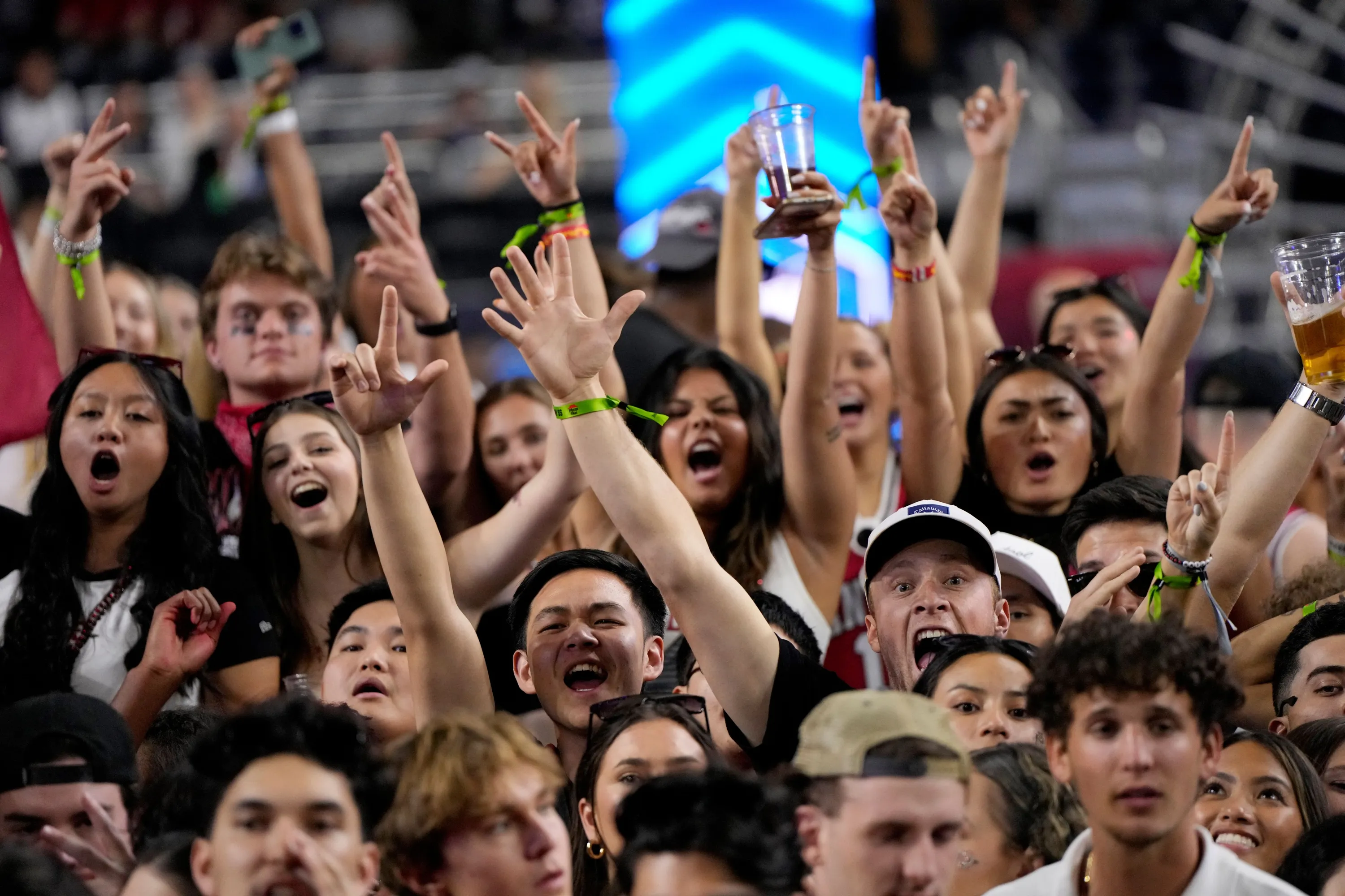 San Diego State fans cheer before the men's national championship college basketball game against Connecticut in the NCAA Tournament on Monday, April 3, 2023, in Houston. (Photo by David J. Phillip/AP Photo)