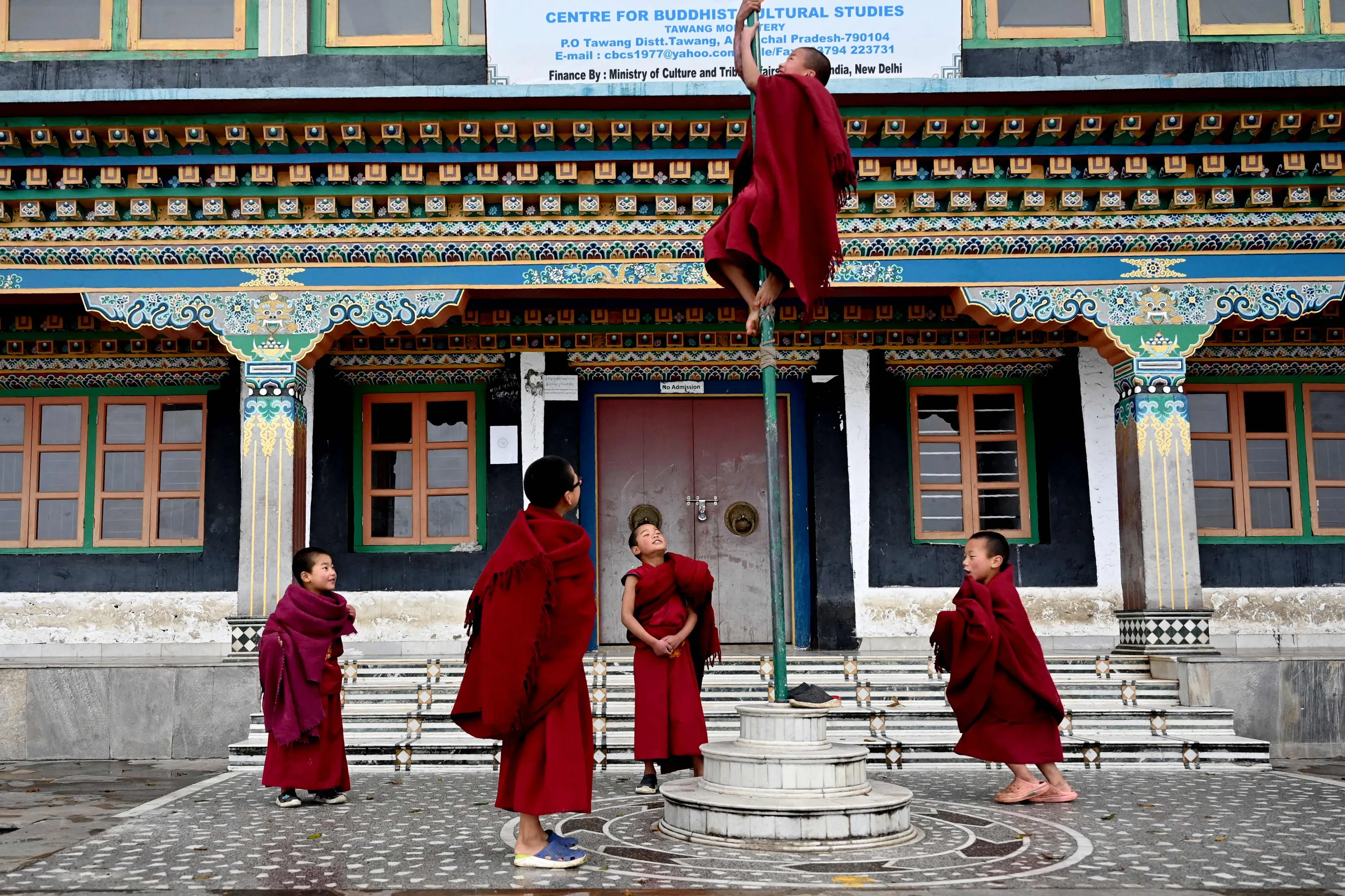 Young Buddhist monks play between prayers at the Tawang monastery in Tawang town in northeast Indian state of Arunachal Pradesh on April 5, 2023. (Photo by Arun Sankar/AFP Photo)