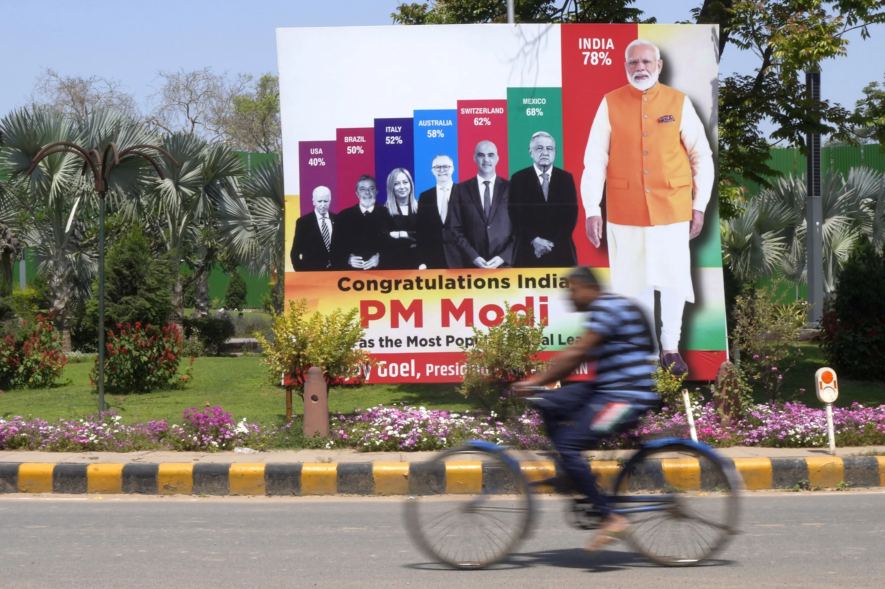 An office-goer on a bicycle rides past a huge hoarding showing Indian prime minister Narendra Modi's popularity among world leaders being the highest, in New Delhi, India, Thursday, April 6, 2023. Over 100 Congress and other opposition lawmakers hold a protest march as the Indian Parliament's budget session ends, marred by shouting and disruption of proceedings in a standoff with the Modi government. They chant slogans warning India's democracy is in danger and accuse the Modi government of “misusing” government-run investigating agencies to intimidate opposition leaders. (Photo by Manish Swarup/AP Photo)