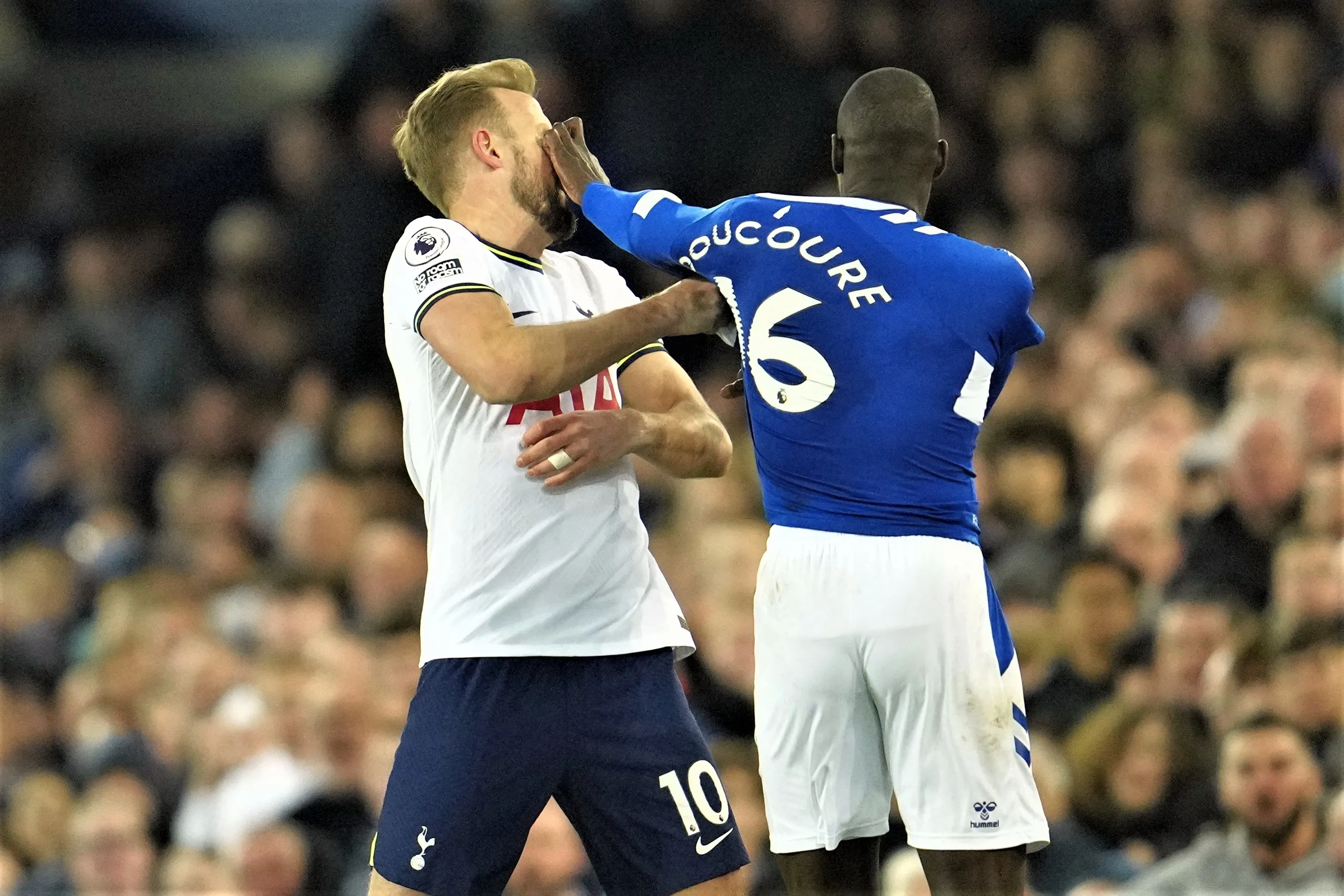 Tottenham's Harry Kane is pushed by Everton's Abdoulaye Doucoure during the English Premier League soccer match between Everton and Tottenham Hotspur at the Goodison Park stadium in Liverpool, England, Monday, April 3, 2023. (Photo by Jon Super/AP Photo)