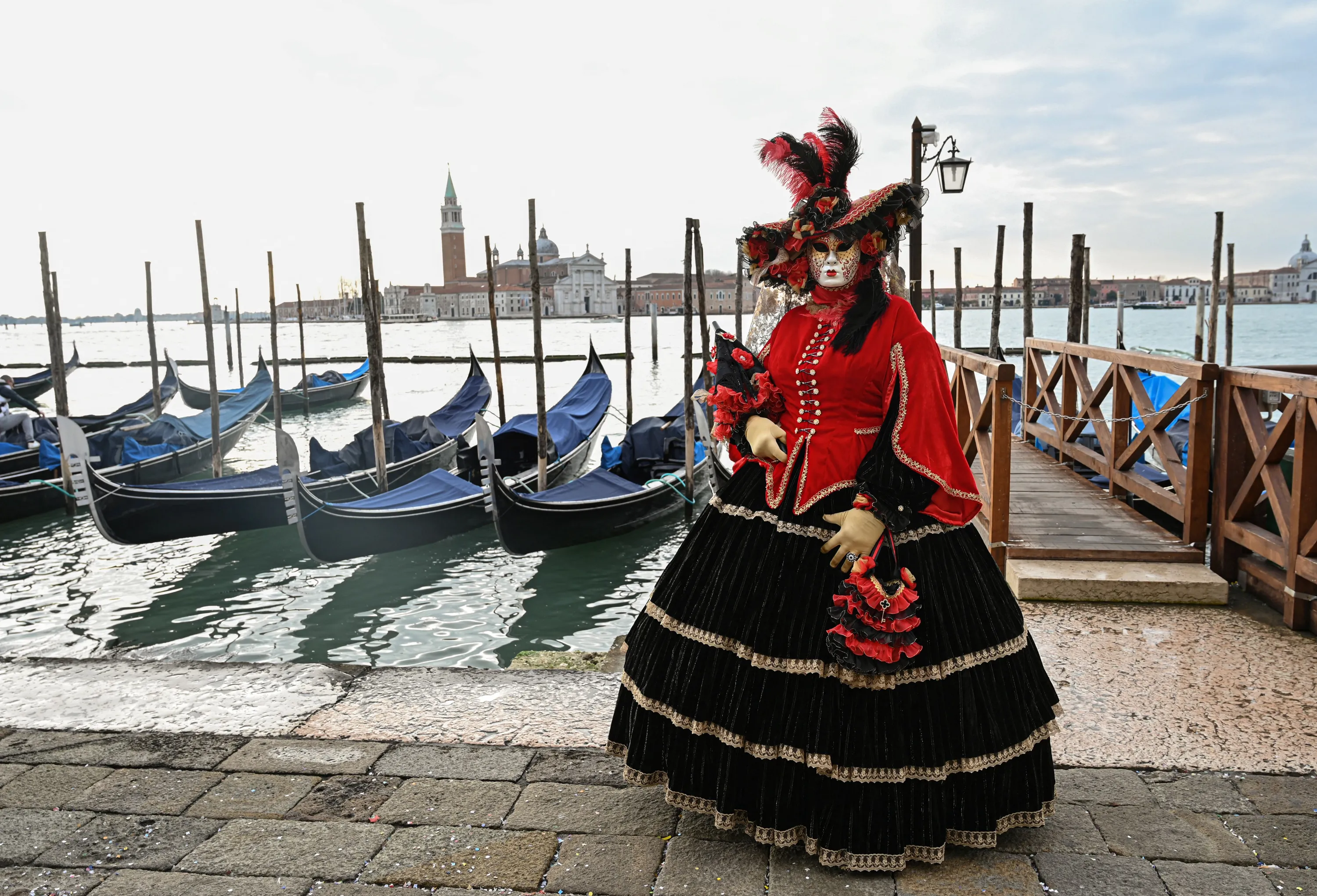 A masked reveller wearing a traditional carnival costume poses on St Mark Square, Venice on February 20, 2022, during the annual carnival. (Photo by Andrea Pattaro/AFP Photo)