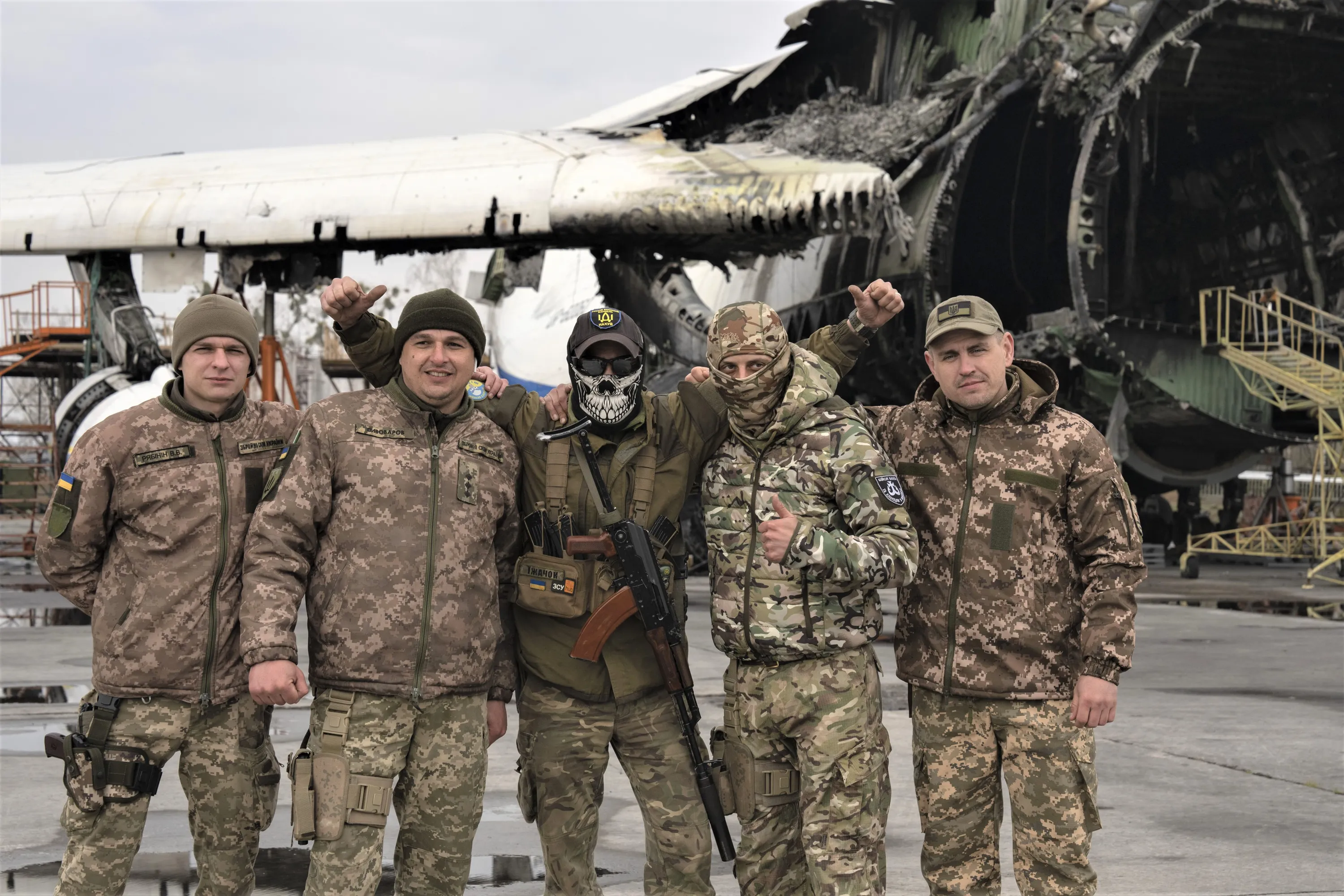 Ukrainian soldiers of mobile air defence units pose for a photo at the Antonov airport, in front of the gutted remains of the Antonov An-225, the world's biggest cargo aircraft, destroyed during fighting between Russian and Ukrainian forces, in Hostomel, on the outskirts of Kyiv, Ukraine, Saturday, April 1, 2023. (Photo by Efrem Lukatsky/AP Photo)
