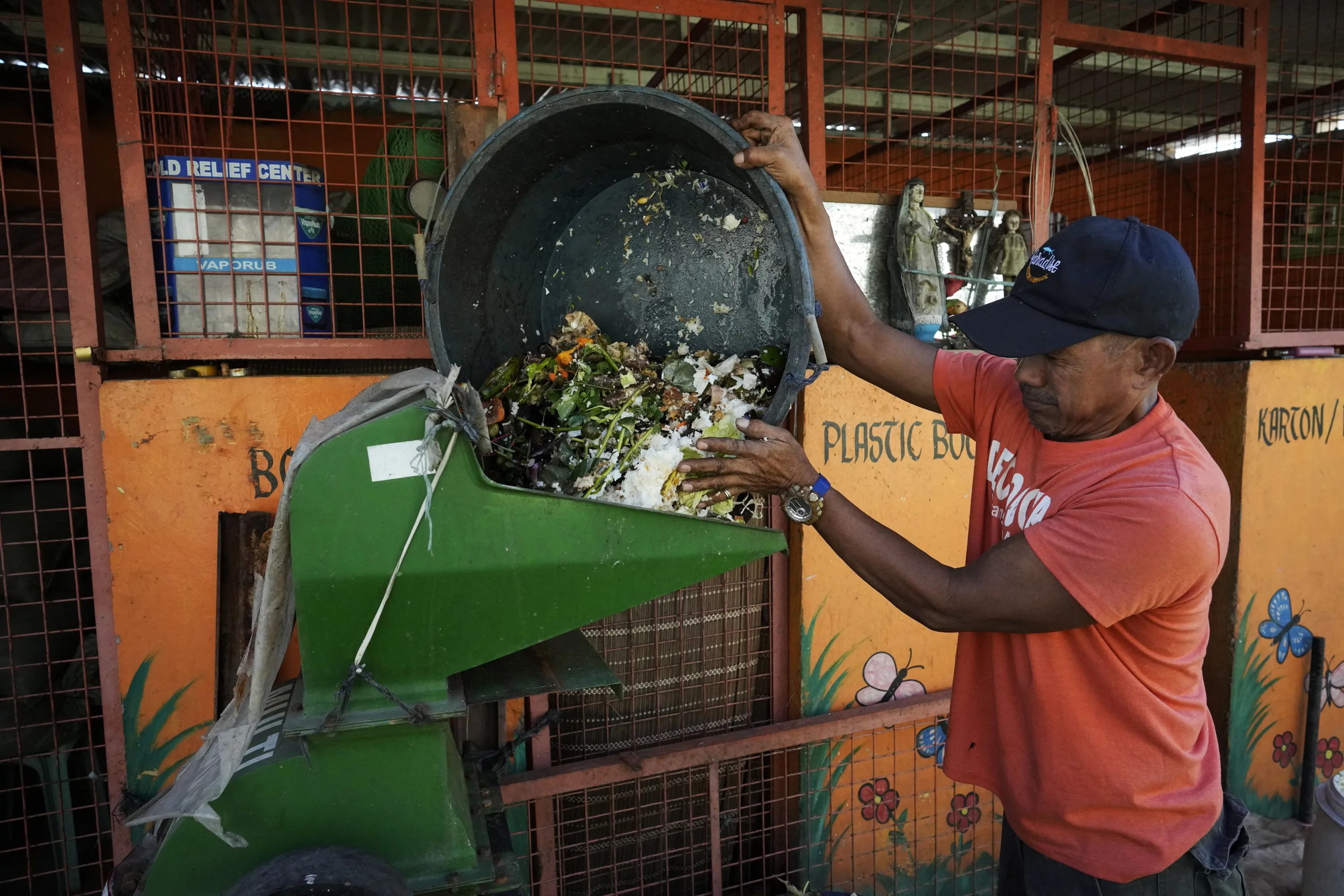 A worker pours garbage on a machine at a recycling facility in Malabon, Philippines on Monday February 13, 2023. Food waste emits methane as it breaks down and rots. Waste pickers are helping set up systems to segregate and collect organic waste, and establishing facilities to compost it. (Photo by Aaron Favila/AP Photo)