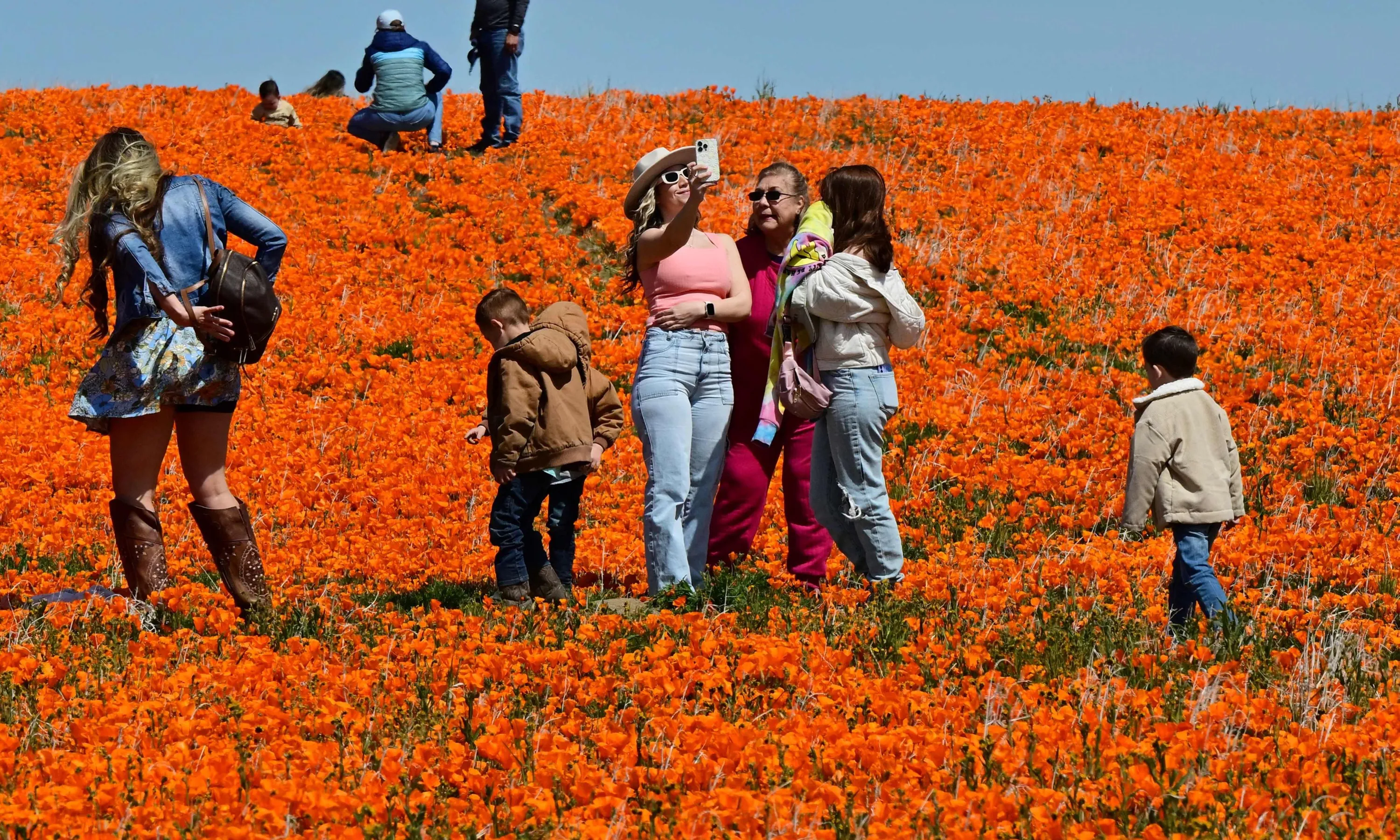 People visit the Antelope Valley California Poppy Reserve in Lancaster, California, to view the flowers blooming on April 6, 2023. California’s biologically diverse landscapes are home to more than 7,000 species of native plants, and the California Poppy, also known as golden poppy, a flowering plant native to the United States and Mexico became the official state flower in 1903. (Photo by Frederic J. Brown/AFP Photo)
