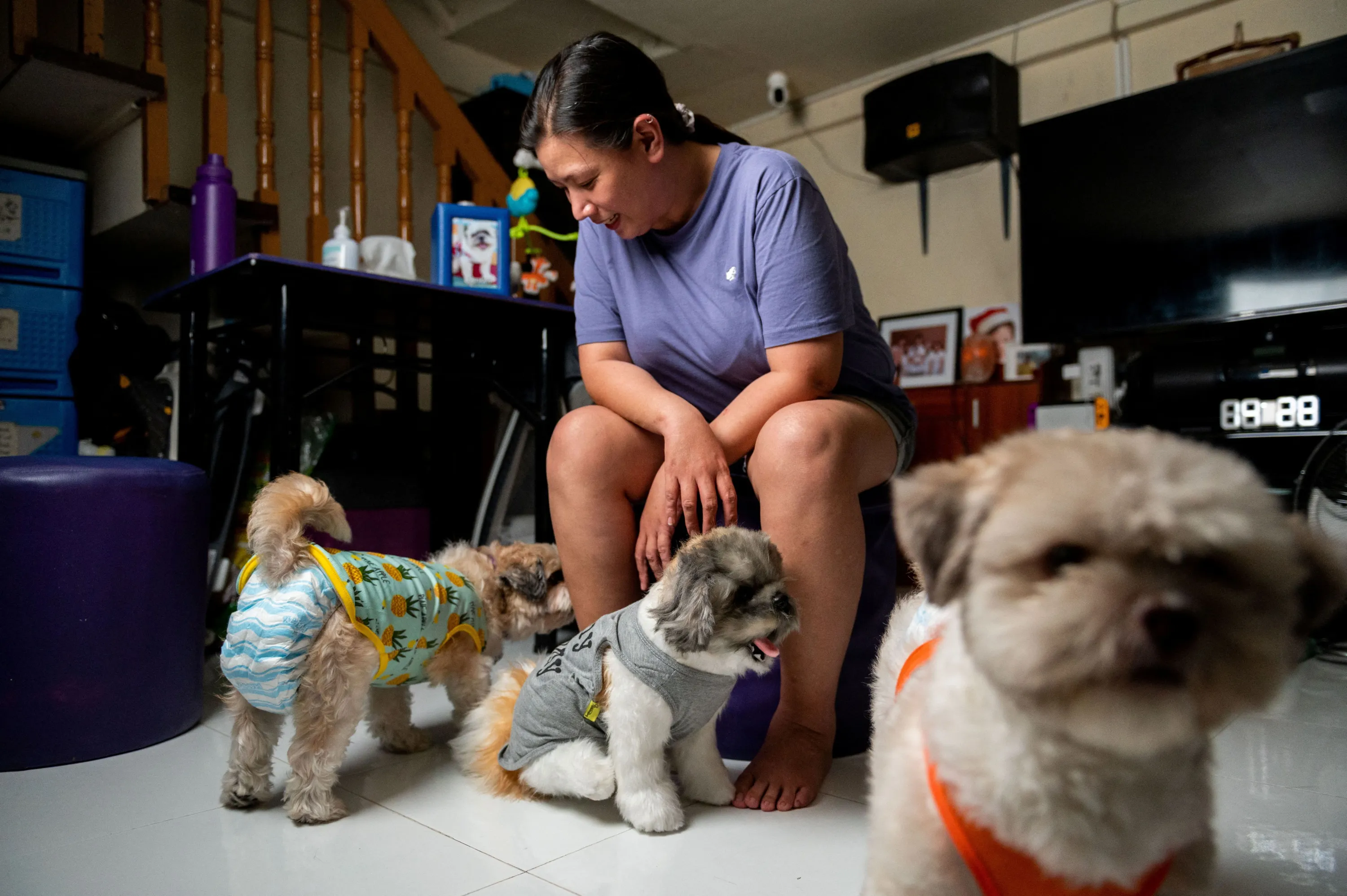 Jaja Lazarte poses for a picture with the realistic pet plushie of her departed dog Kenken and her two other dogs, at her home in Caloocan City, Metro Manila, Philippines on March 23, 2023. (Photo by Lisa Marie David/Reuters)