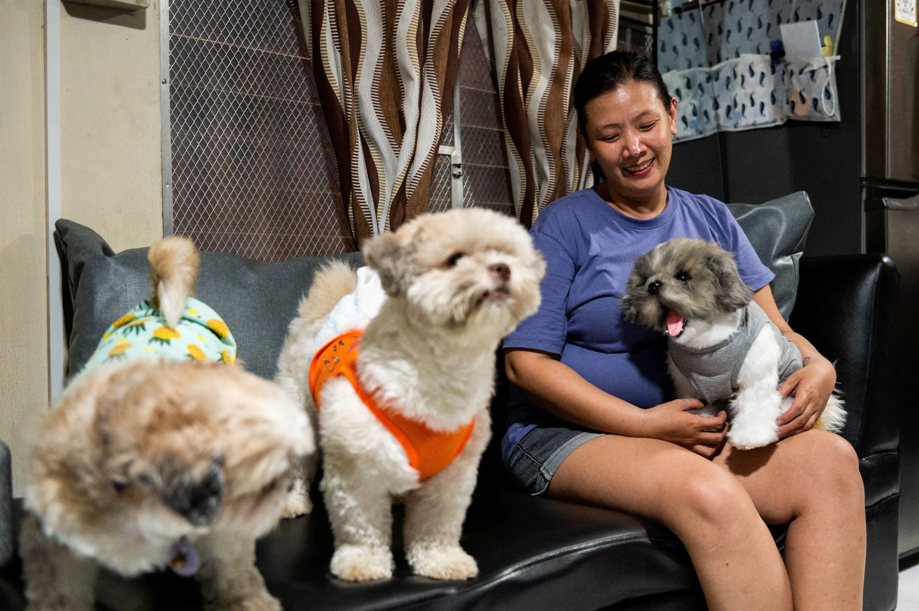 Jaja Lazarte holds the realistic pet plushie of her departed dog Kenken as she poses for a photo with her two other dogs, at her home in Caloocan City, Metro Manila, Philippines on March 23, 2023. (Photo by Lisa Marie David/Reuters)