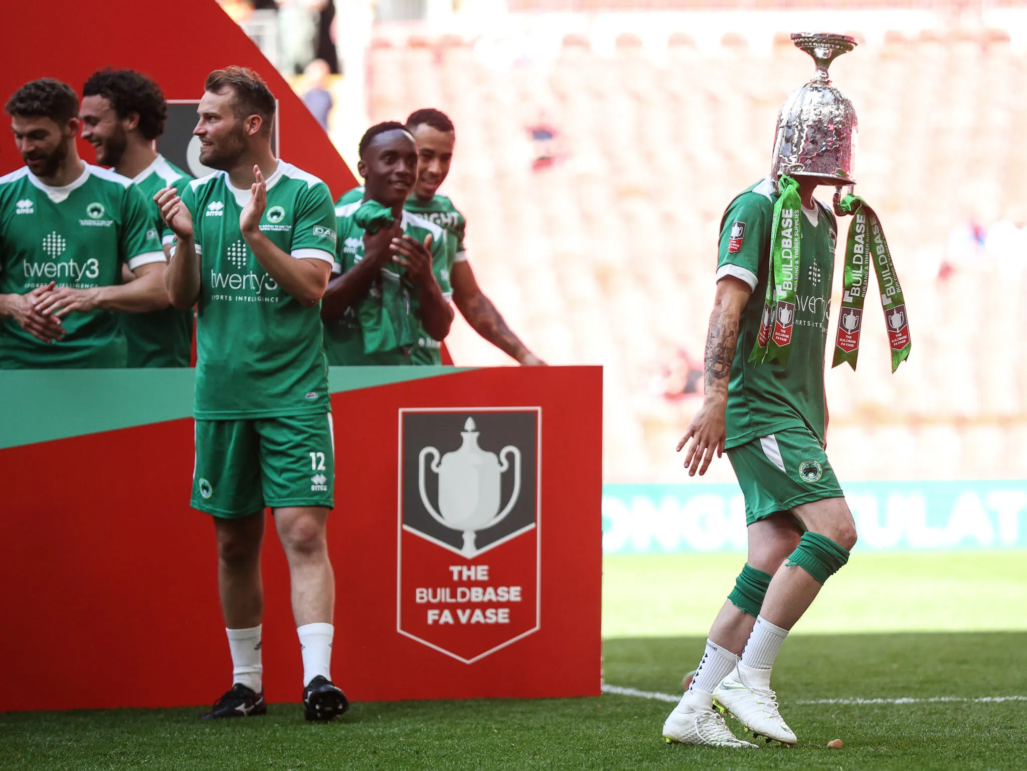 Goal scorer Kieran Barnes of Newport Pagnell Town with the trophy on his head as their team wins the FA Vase by beating Littlehampton Town 3-0 during the Buildbase FA Vase Final between Littlehampton Town and Newport Pagnell Town at Wembley Stadium on May 22, 2022 in London, England. (Photo by Eddie Keogh – The FA/The FA via Getty Images)