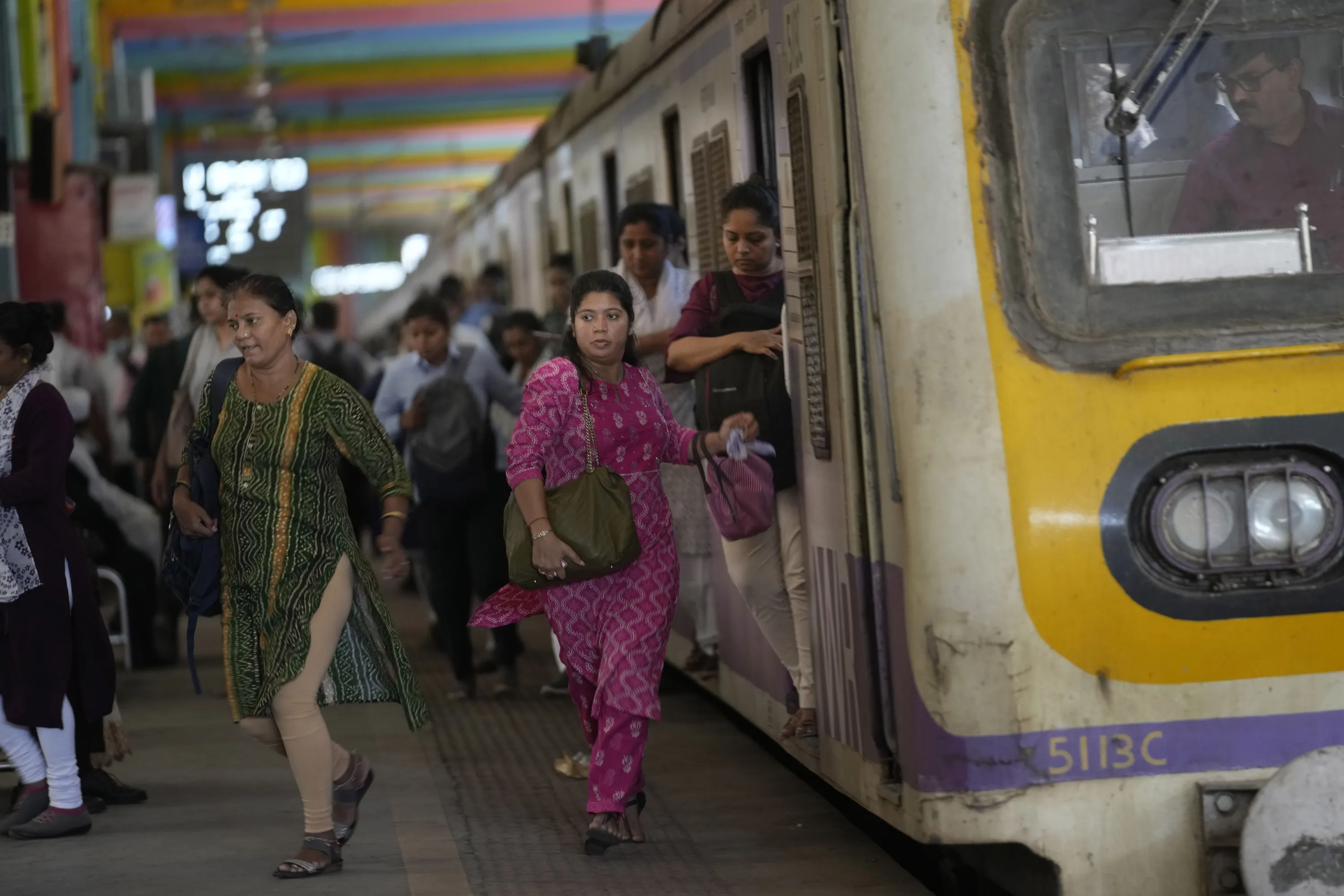 Women rush out of a train during peak hours at Churchgate station in Mumbai, India, Monday, March 20, 2023. 39 million women are employed in India's workforce compared to 361 million men, according to the Center for Monitoring the Indian Economy (CMIE). (Photo by Rajanish Kakade/AP Photo)