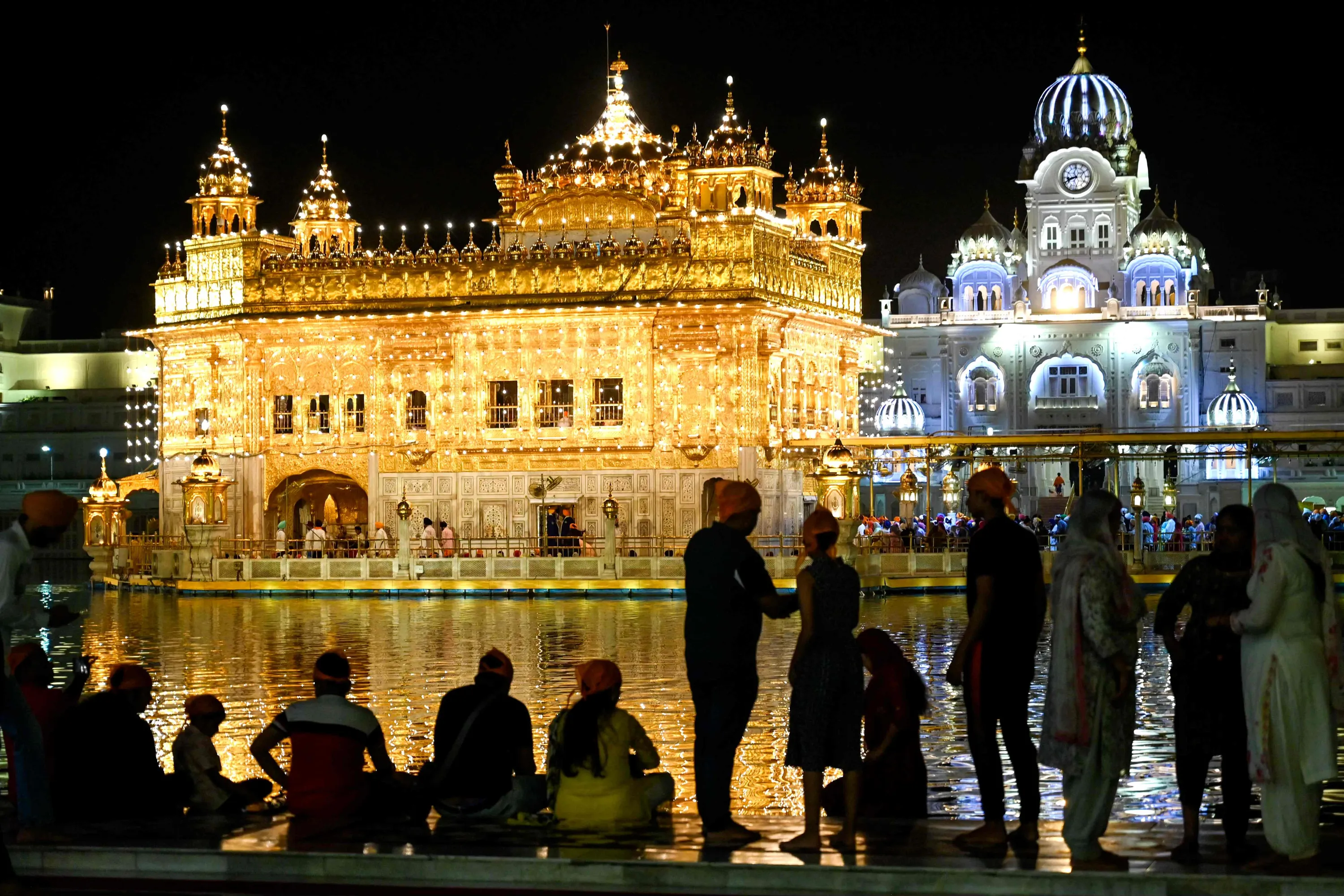 Devotees visit the illuminated Golden Temple on the eve of birth anniversary of the ninth Sikh Guru Teg Bahadur, in Amritsar on April 10, 2023. (Photo by Narinder Nanu/AFP Photo)