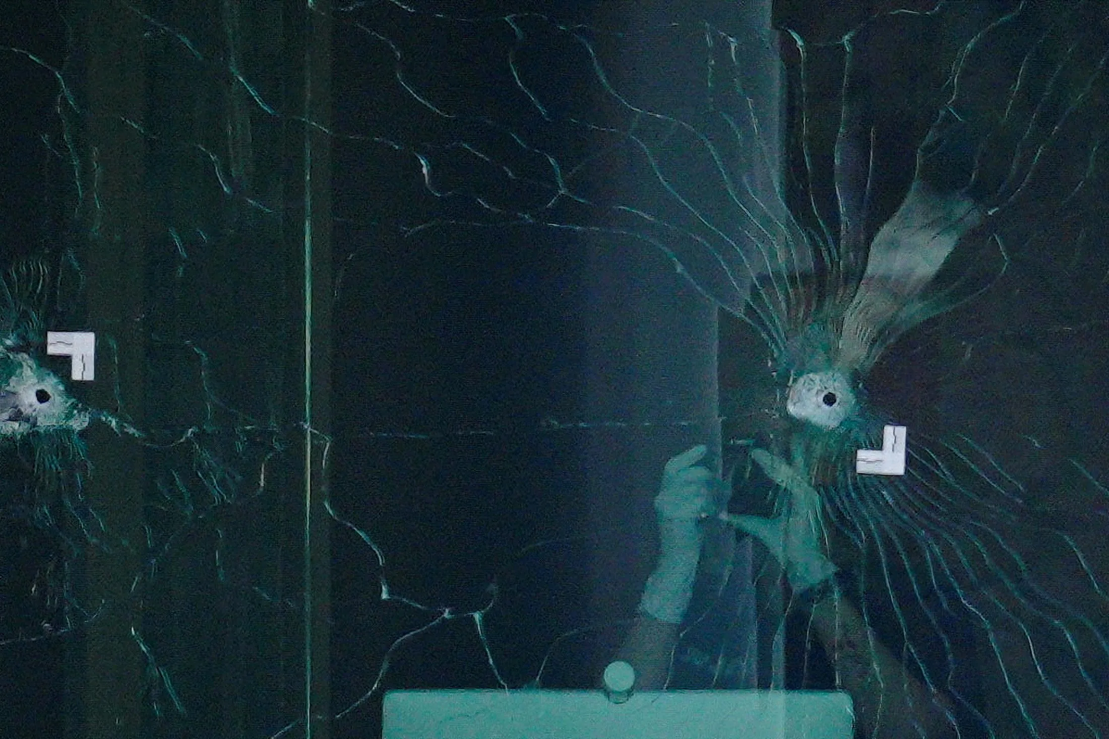 Investigators inspect bullet holes at the scene of a mass shooting at Old National Bank in downtown Louisville, Kentucky, U.S. April, 10, 2023. (Photo by Jeffrey Dean/Reuters)