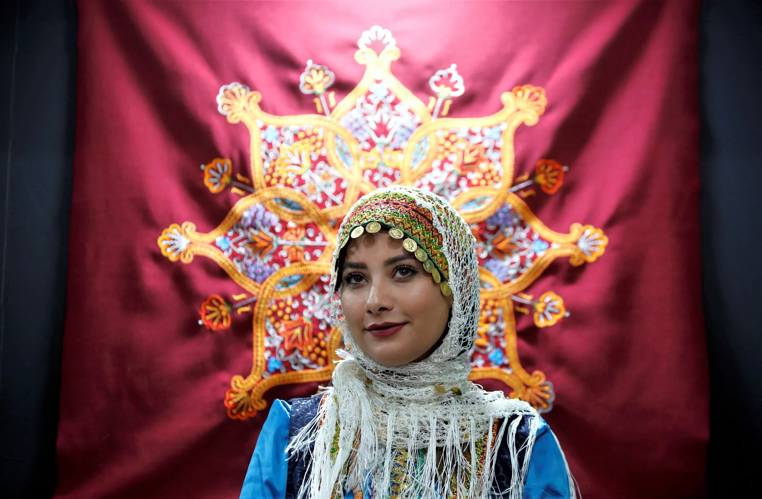 An Iranian woman wearing Gilaki traditional outfit attends the 16th International Exhibition of Tourism and Related Industries at the Tehran's international exhibition complex in Tehran, Iran, 08 February 2023. The exhibition runs until 10 February 2023. (Photo by Abedin Taherkenareh/EPA/EFE)