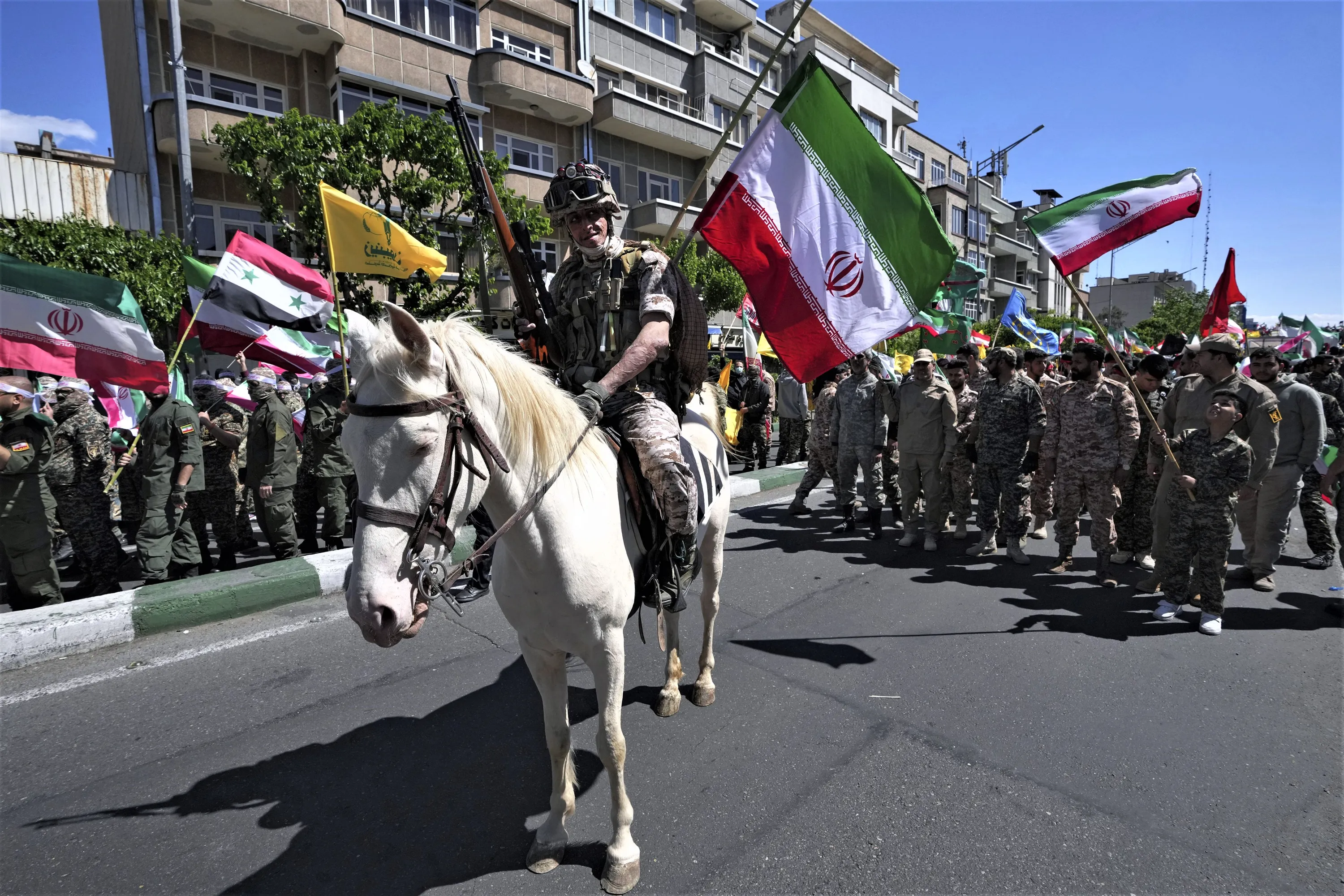 A member of the Iranian paramilitary Basij force rides a horse while attending a rally to mark Jerusalem Day, an annual show of support for the Palestinians, in Tehran, Iran, Friday, April 14, 2023. (Photo by Vahid Salemi/AP Photo)
