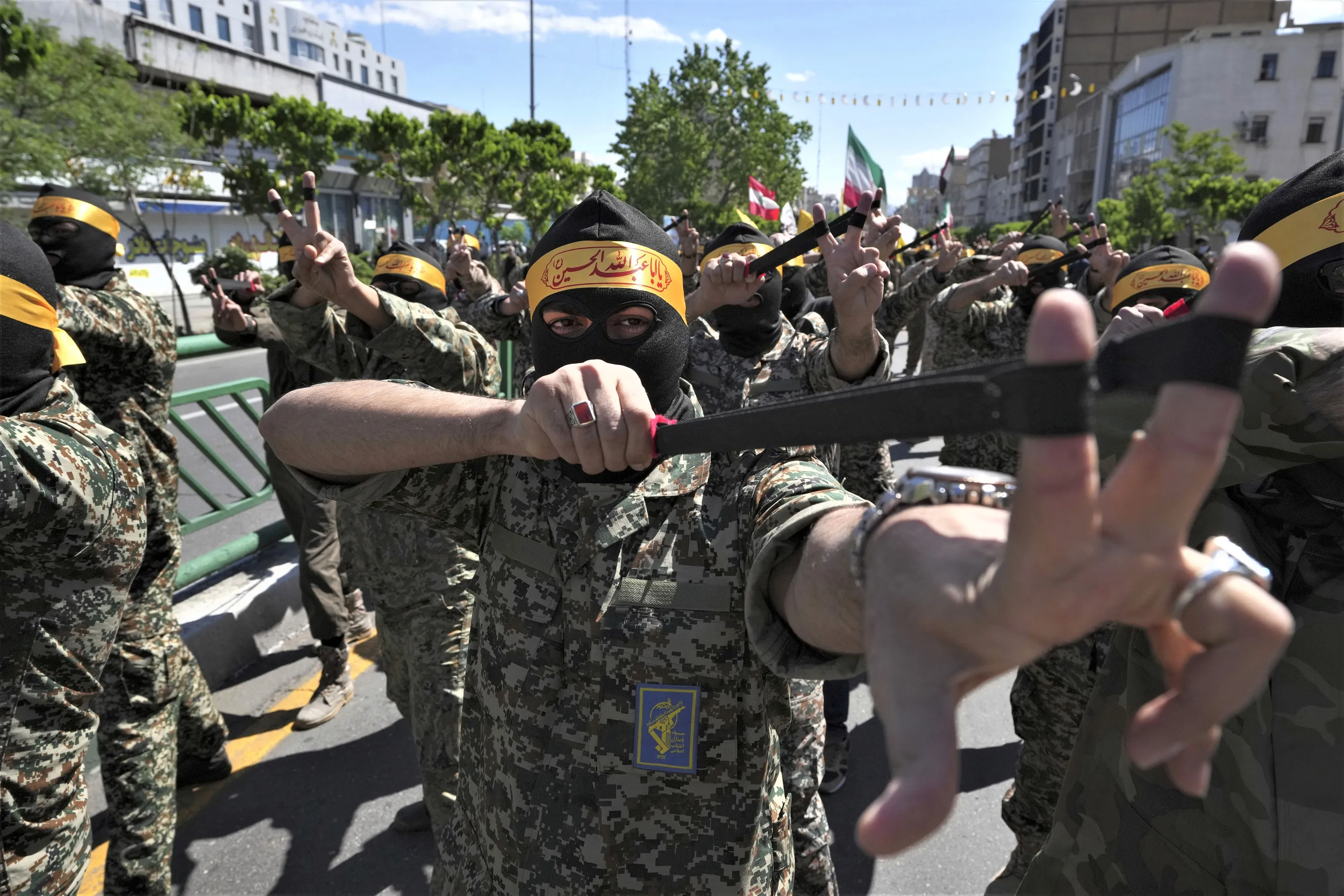 Members of the Iranian paramilitary Basij force symbolically use slingshot to show Palestinian boys confronting Israeli forces, in their rally to mark Jerusalem Day, an annual show of support for the Palestinians, in Tehran, Iran, Friday, April 14, 2023. (Photo by Vahid Salemi/AP Photo)