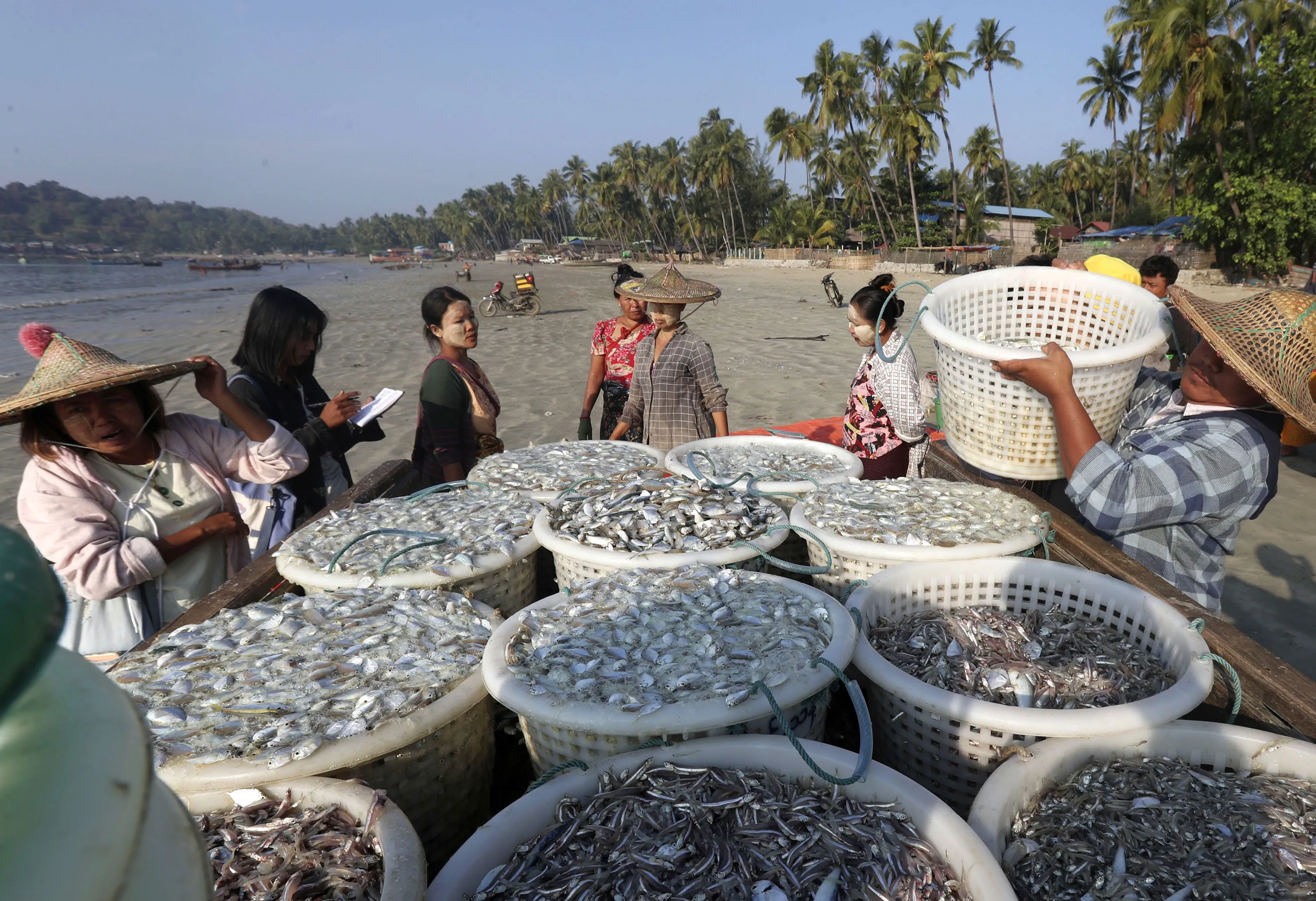 Fishermen unload the day's catch from a fishing boat at Ngapali Beach near a fishing village in Myanmar's western Rakhine State, Saturday, December 31, 2022. (Photo by Aung Shine Oo/AP Photo)