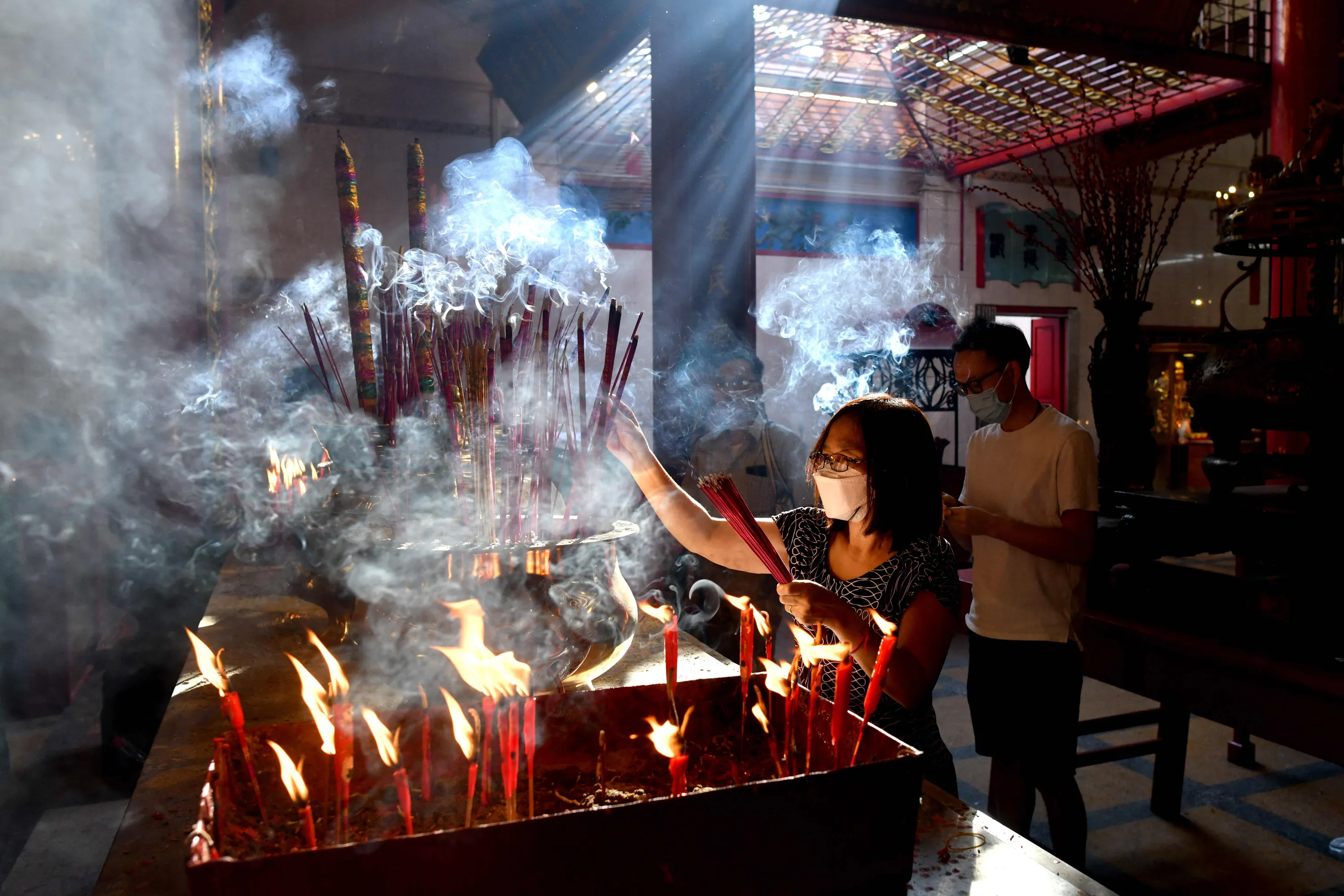 A woman burns incense sticks inside a Chinese temple on the first day of the Lunar New Year in Yangon's Chinatown on January 22, 2023 which ushers in the Year of the Rabbit. (Photo by Sai Aung Main/AFP Photo)