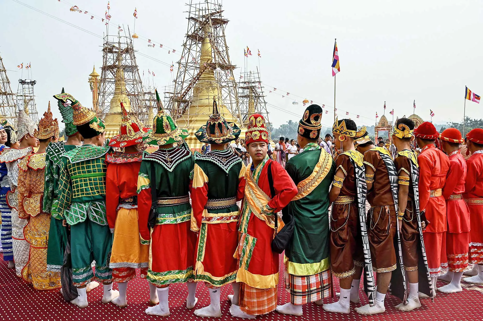 People dressed in traditional religious clothing gather for a Buddhist ceremony in which an auspicious golden umbrella is placed at the top of a pagoda, donated by Karen state Border Guard Forces chief Saw Chit Thu, at Pyi Thar Lin Aye pagoda in Hlaingbwe township in Karen state on March 5, 2023. (Photo by AFP Photo/Stringer)