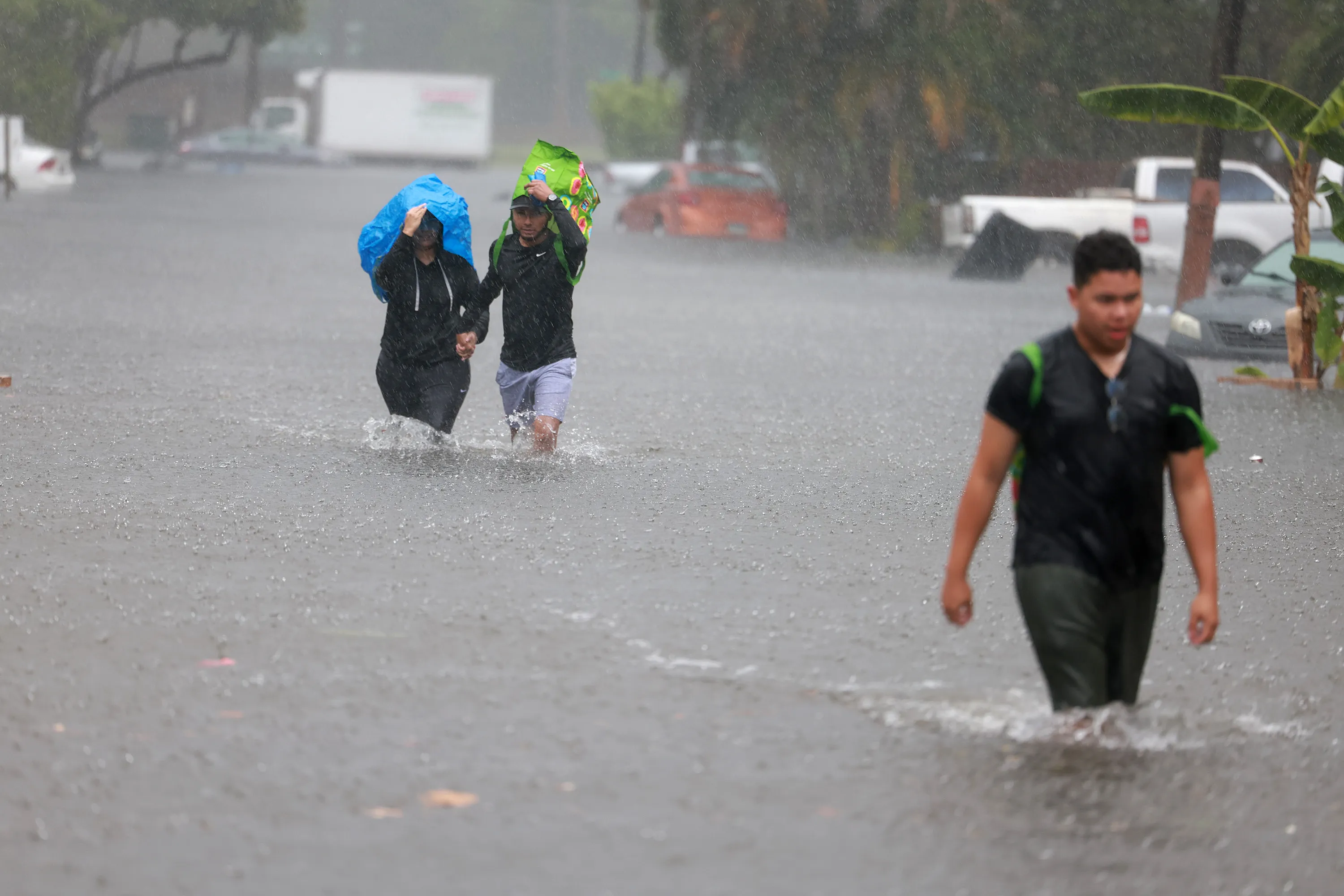 (L-R) Denis Mendez, Isain Lopez, and Santiago Rojas walk through a flooded street on April 13, 2023 in Fort Lauderdale, Florida. Nearly 26 inches of rain fell on Fort Lauderdale over a 24-hour period, with more expected throughout the day, according to the National Weather Service. Fort Lauderdale-Hollywood International Airport traffic is closed until 5 a.m. Friday. (Photo by Joe Raedle/Getty Images)