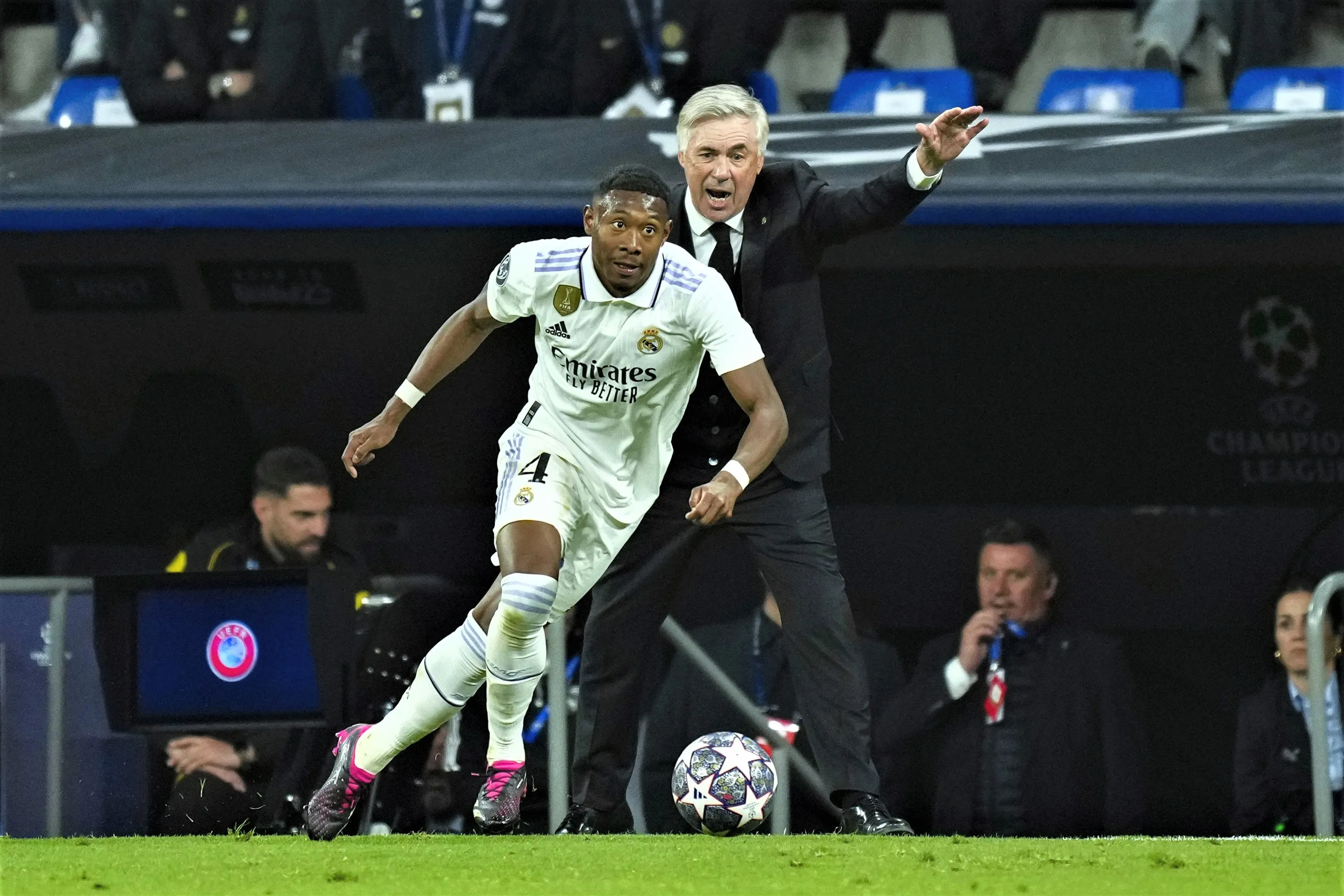 Real Madrid's David Alaba runs with the ball near Real Madrid's head coach Carlo Ancelotti, background, during the Champions League quarter final first leg soccer match between Real Madrid and Chelsea at Santiago Bernabeu stadium in Madrid, Wednesday, April 12, 2023. Real Madrid won 2-0. (Photo by Jose Breton/AP Photo)