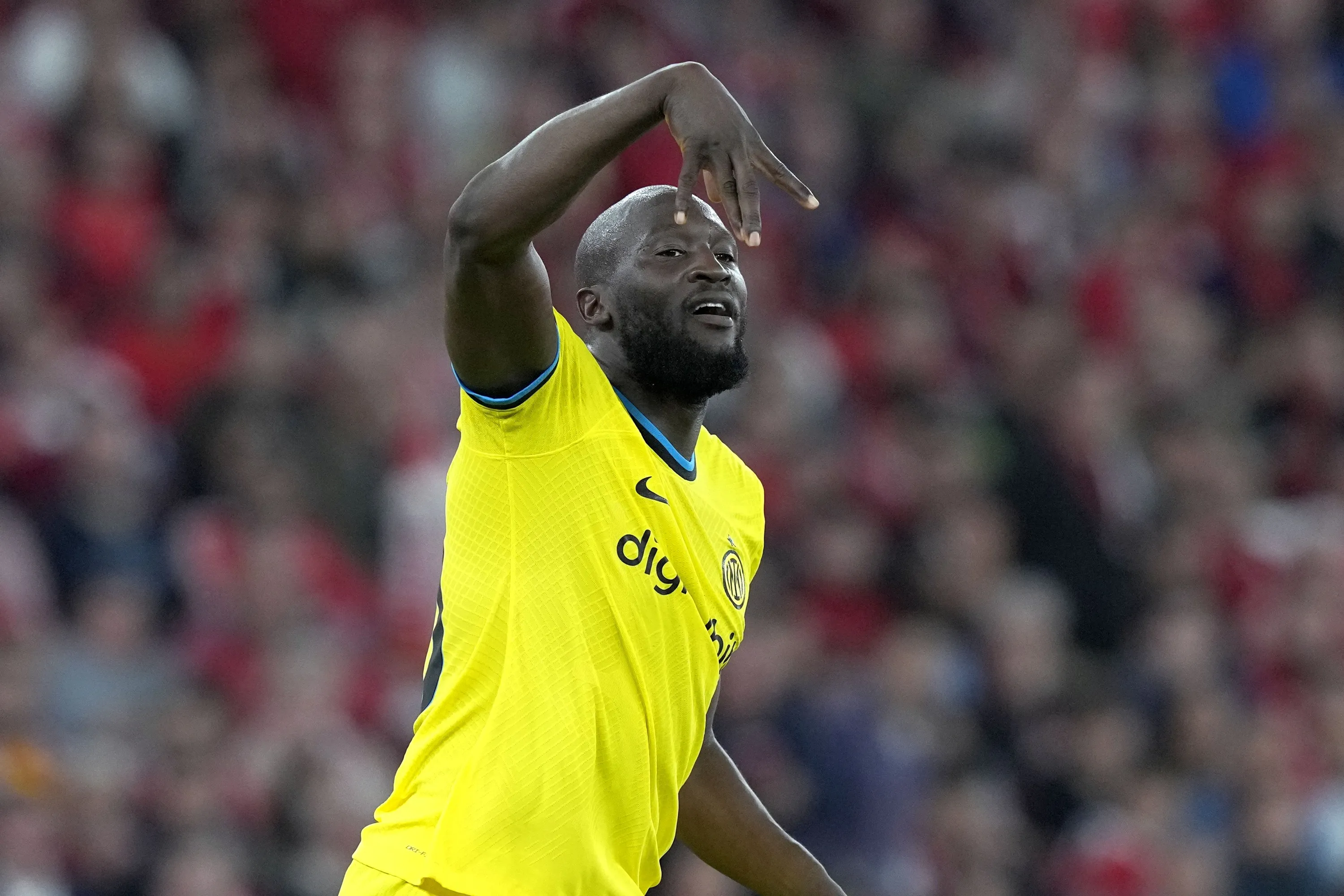 Inter Milan's Romelu Lukaku celebrates after scoring his side's second goal during the Champions League quarter final first leg soccer match between Benfica and Inter Milan at Luz stadium in Lisbon, Tuesday, April 11, 2023. (Photo by Armando Franca/AP Photo)